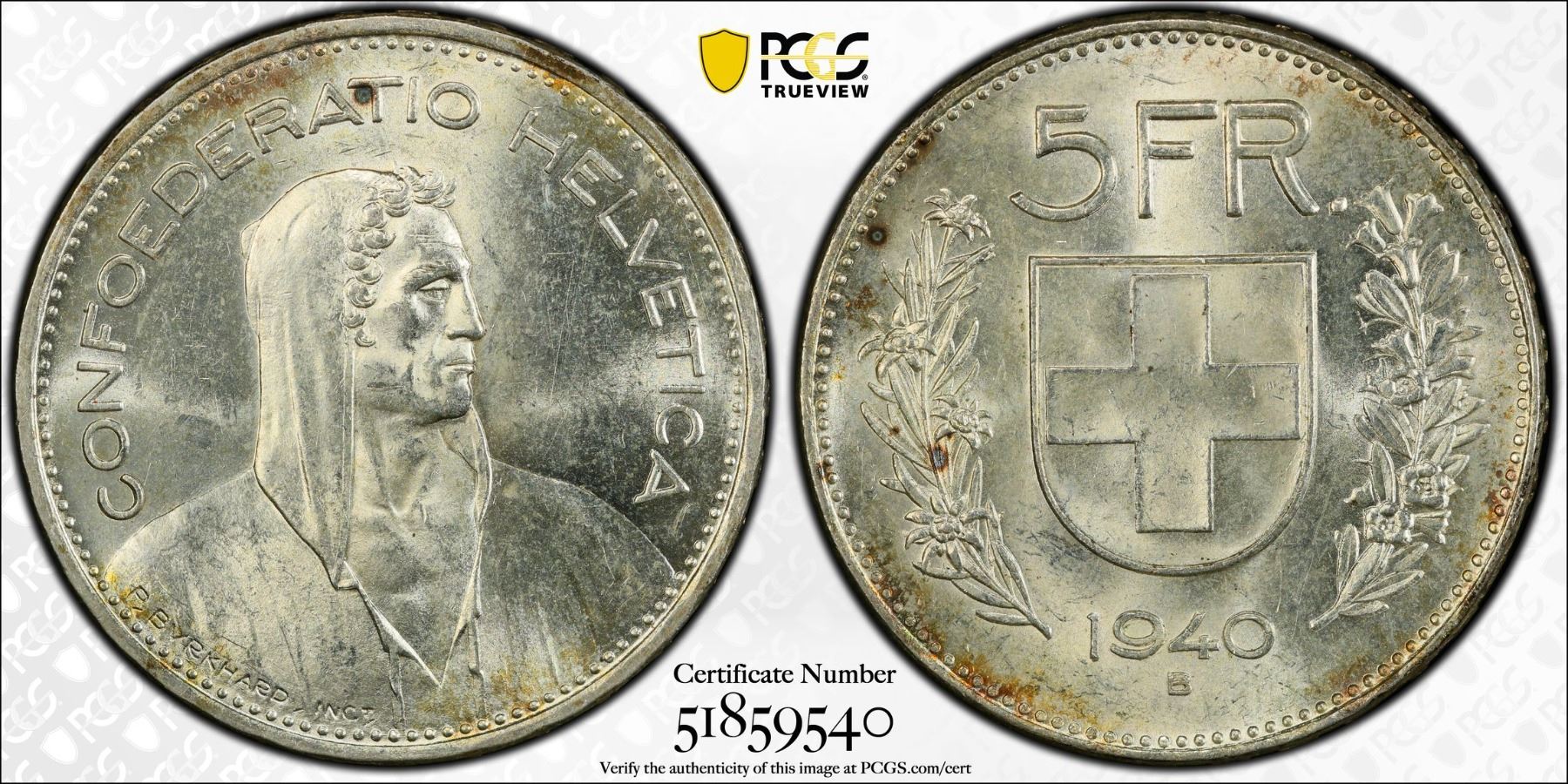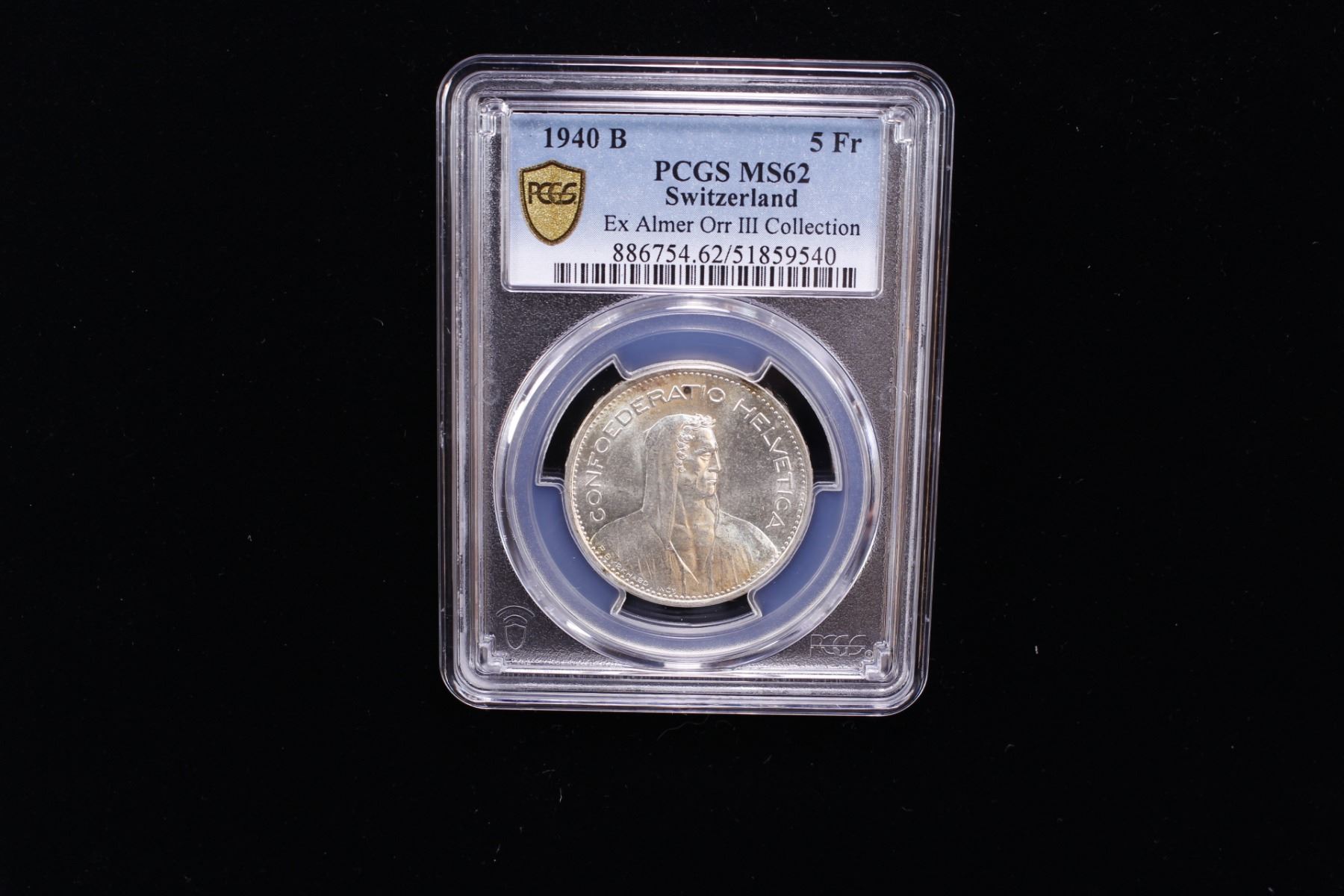 SWITZERLAND: Confederation, AR 5 francs, 1940-B, KM-40, Y-36, an attractive example, PCGS graded MS62, ex Almer H. Orr III Collection.