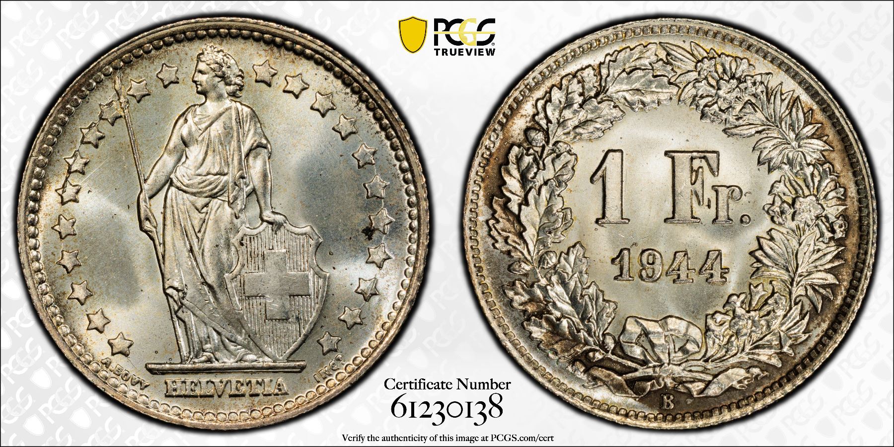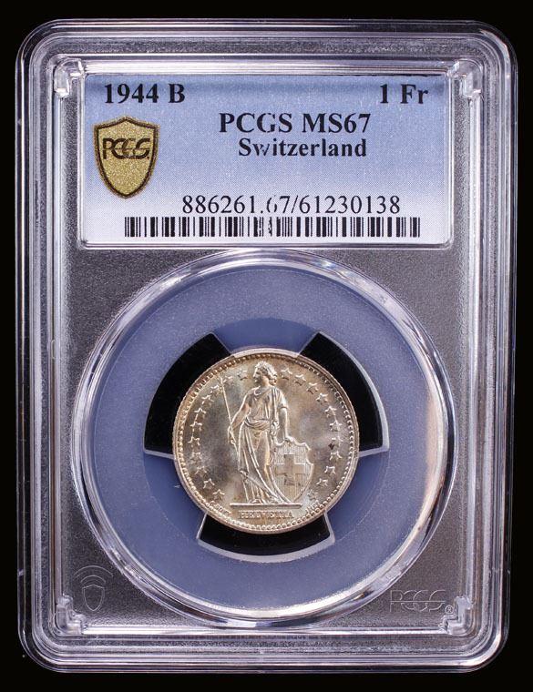 SWITZERLAND: Confederation, AR franc, 1944-B, PCGS MS67