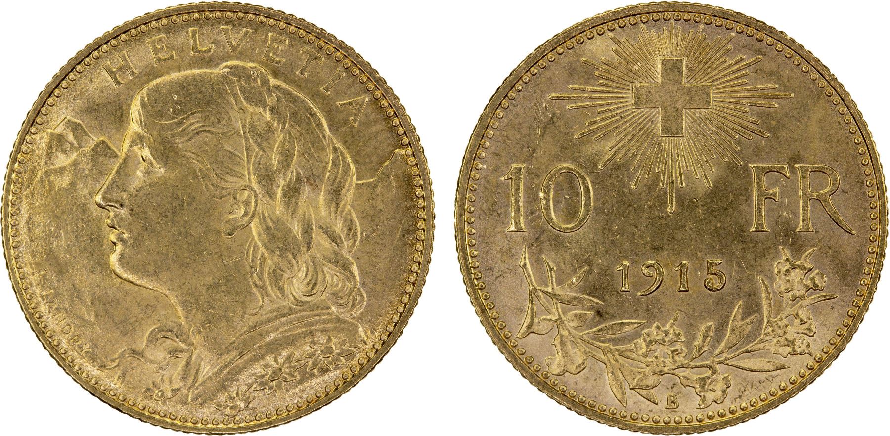SWITZERLAND: Confederation, AV 10 francs, 1915-B, KM-36, Fr-504, lustrous, Choice AU.