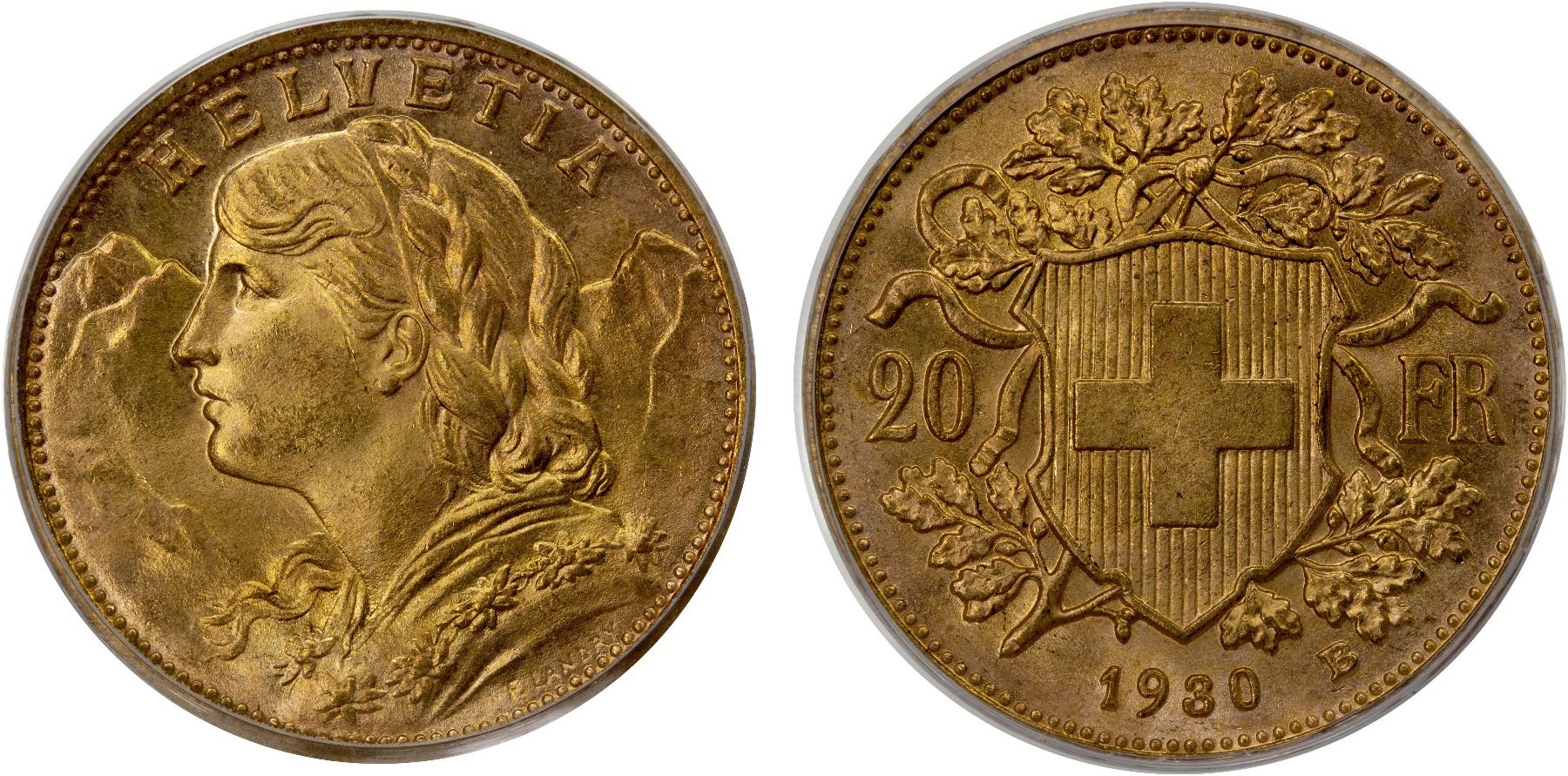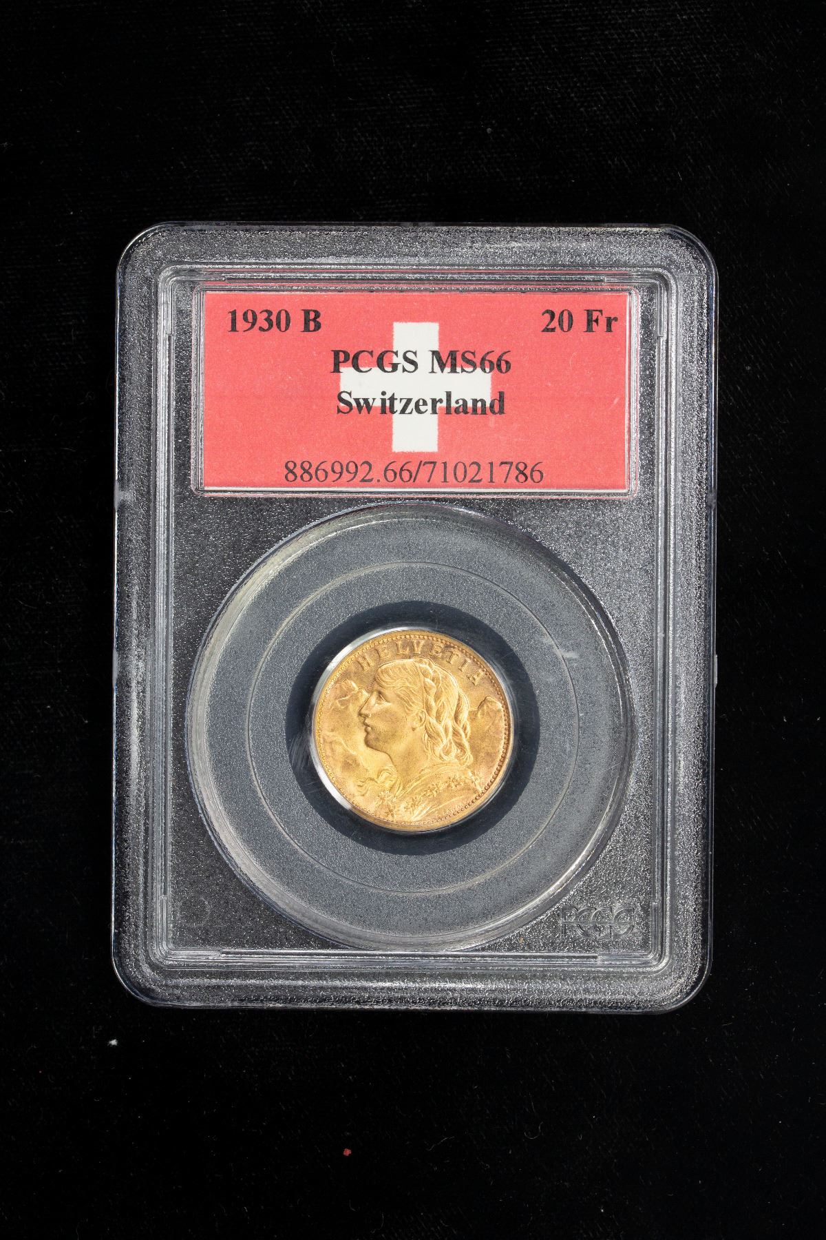 SWITZERLAND: Confederation, AV 20 francs, 1930-B, KM-35.1, Fr-499, in special PCGS holder with red label, a lovely example! PCGS graded MS66.