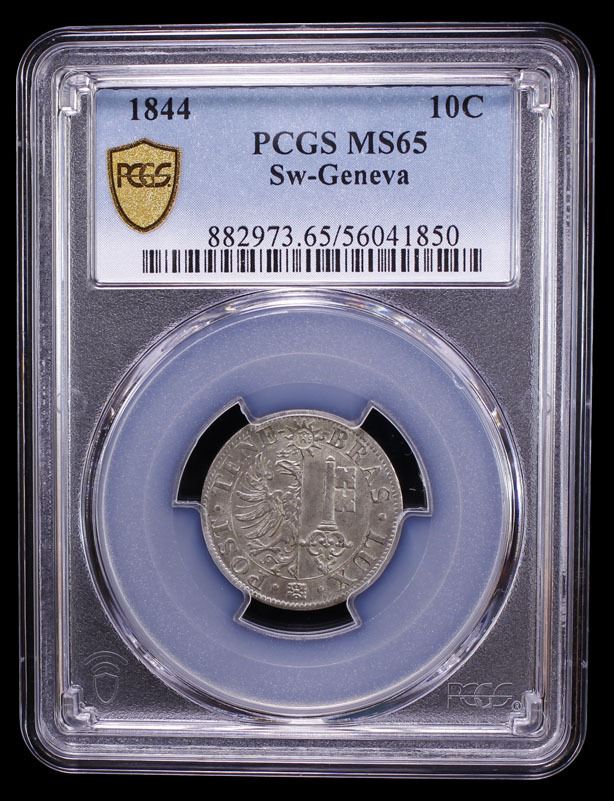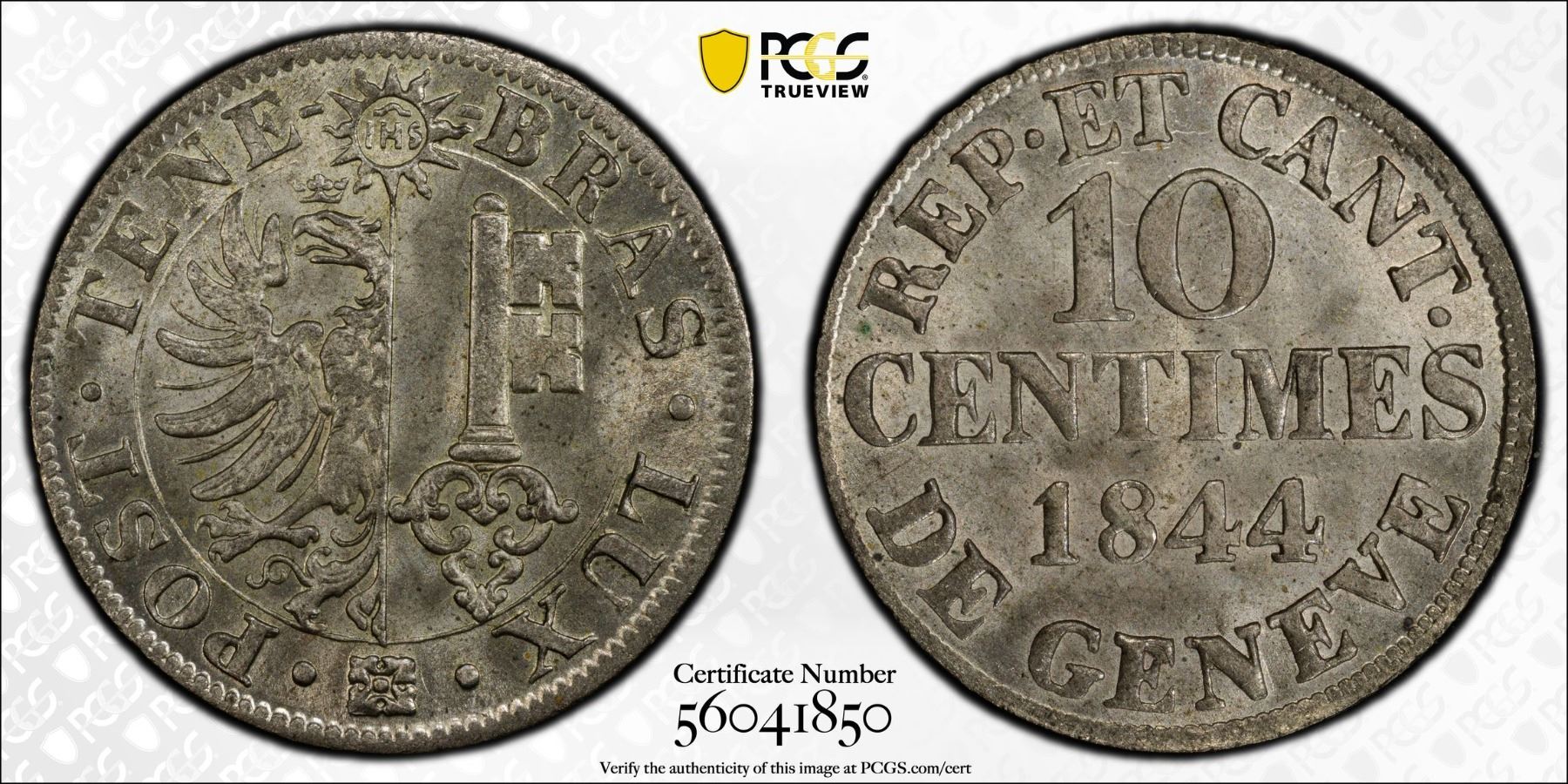 GENEVA: Canton, BI 10 centimes, 1844, KM-128, C-67, a superb example, PCGS graded MS65.