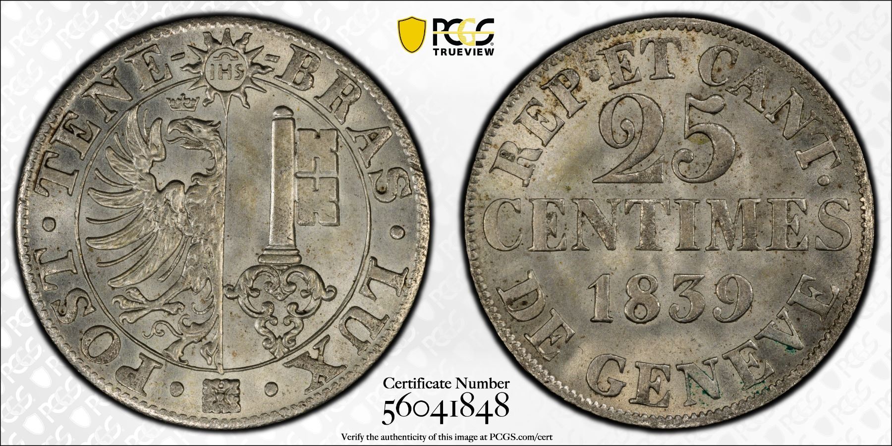 SWITZERLAND: GENEVA: Canton, BI 25 centimes, 1839, PCGS MS65