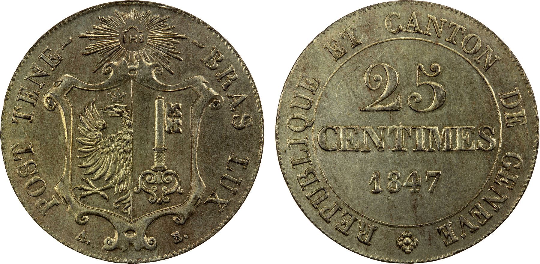 GENEVA: Canton, BI 25 centimes, 1847, KM-135, Cr-71, variety in billon, very lustrous, overstruck on unknown host, Choice AU, ex Joe Sedillot Collection.