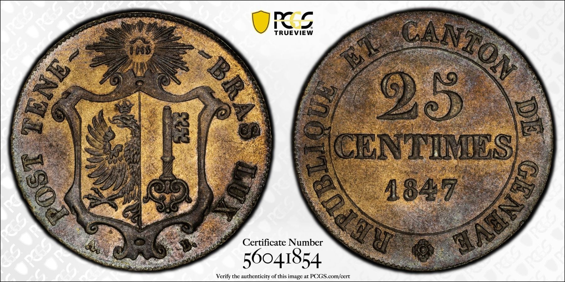 SWITZERLAND: GENEVA: Canton, BI 25 centimes, 1847, PCGS MS64