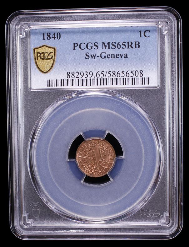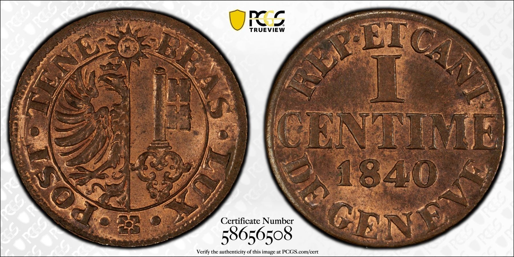 SWITZERLAND: GENEVA: Republic & Canton, AE centime, 1840, PCGS MS65 RB