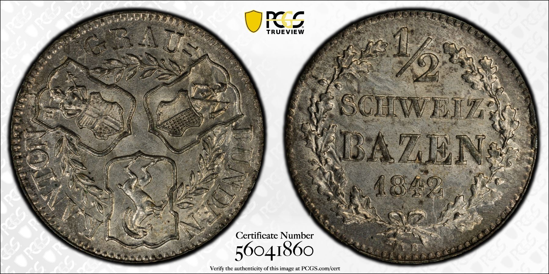 GRAUBUNDEN (GRISONS): Canton, BI 1/2 batzen, 1842, KM-13, a superb example, PCGS graded MS65.