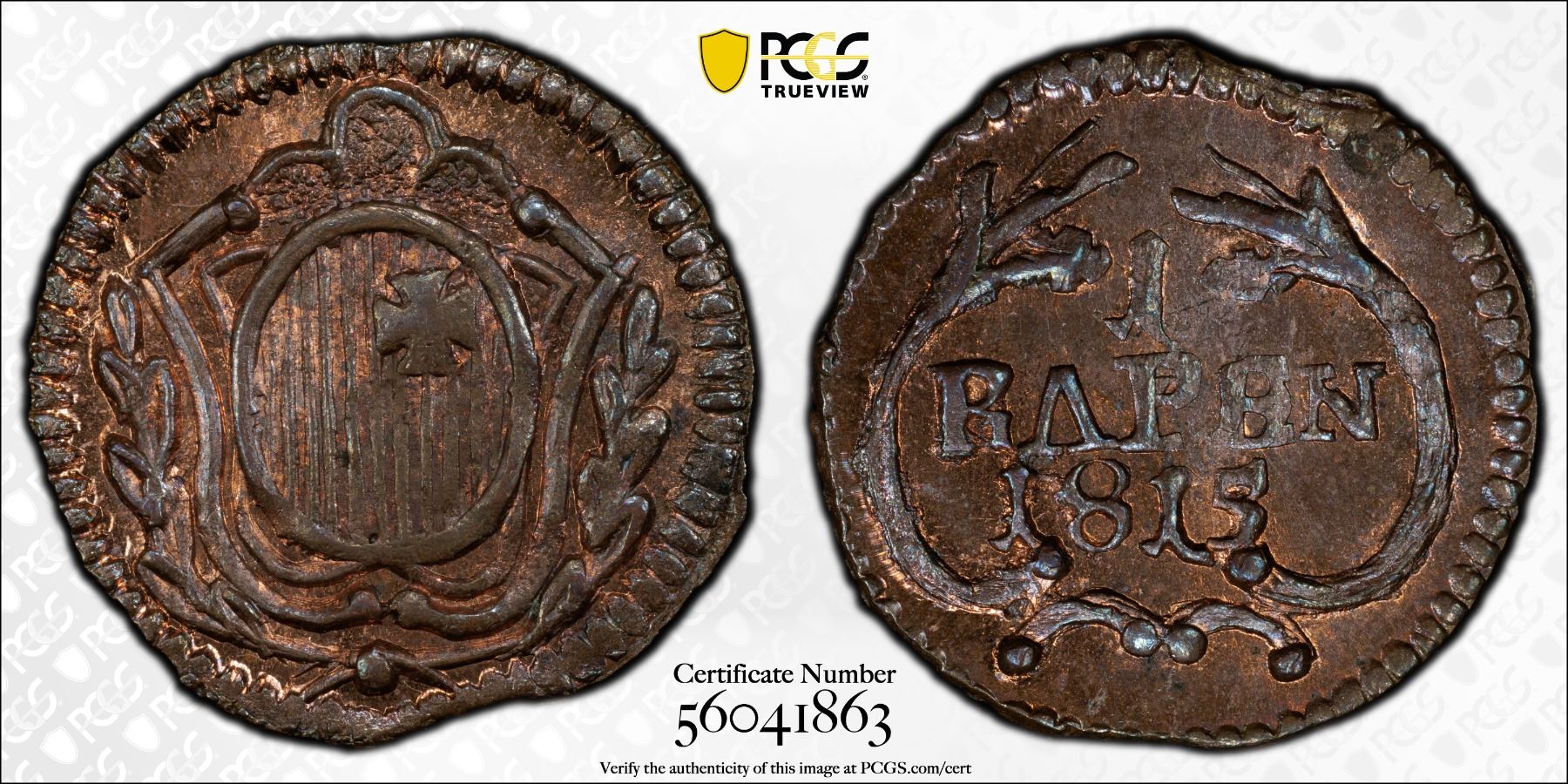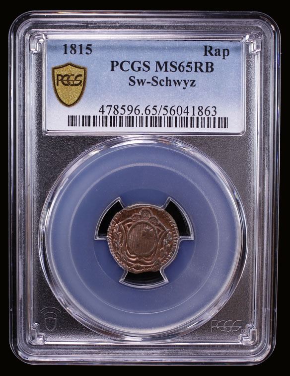 SWITZERLAND: SCHWYZ: Canton, AE rappen, 1815, PCGS MS65 RB