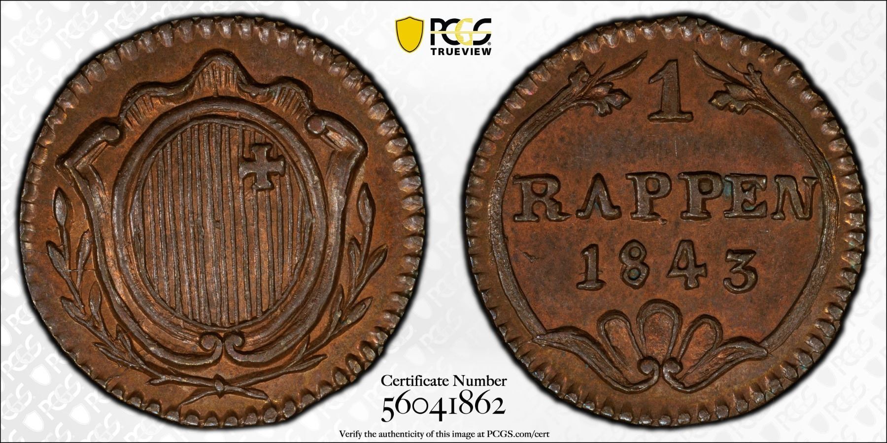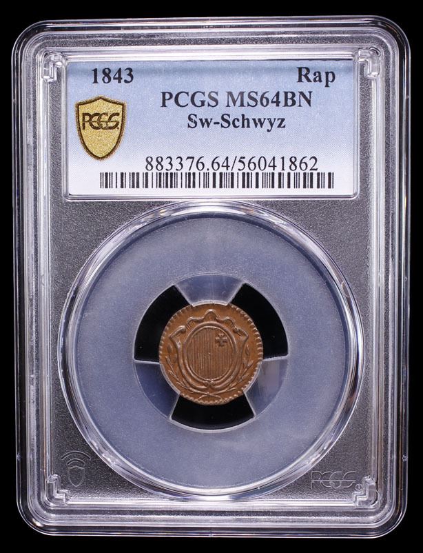 SWITZERLAND: SCHWYZ: Canton, AE rappen, 1843, PCGS MS64 BN