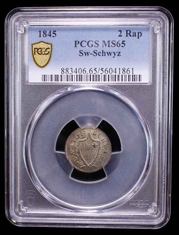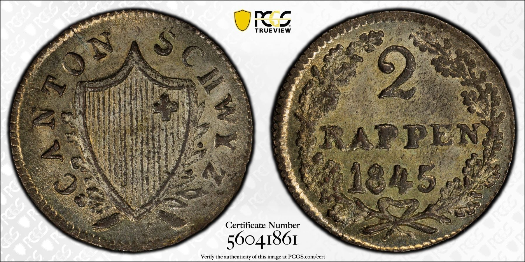 SWITZERLAND: SCHWYZ: Canton, BI 2 rappen, 1845, PCGS MS65