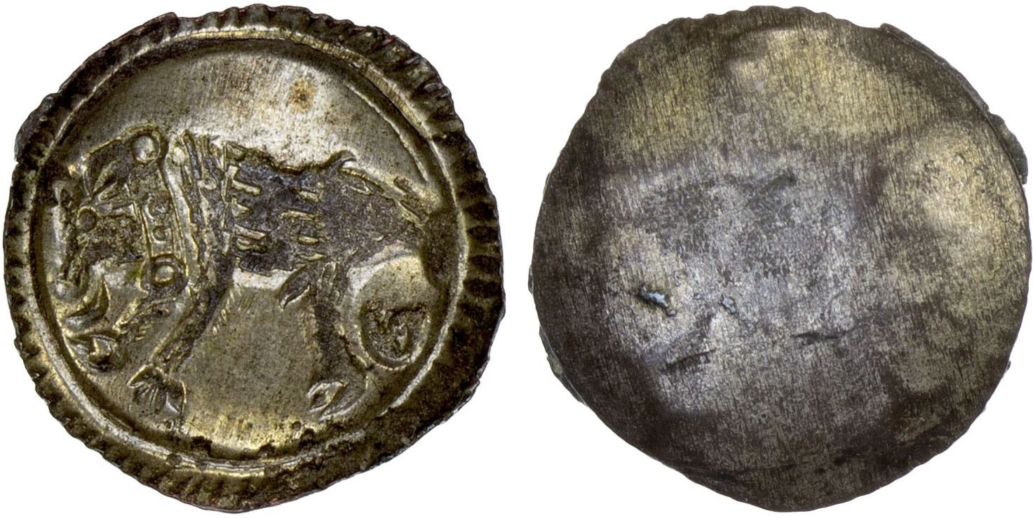 ST. GALLEN: BI pfennig (0.20g), ND (ca. 18th century), bear rampant left, G below, uniface, struck on a scyphate flan, beautiful luster, Choice AU.