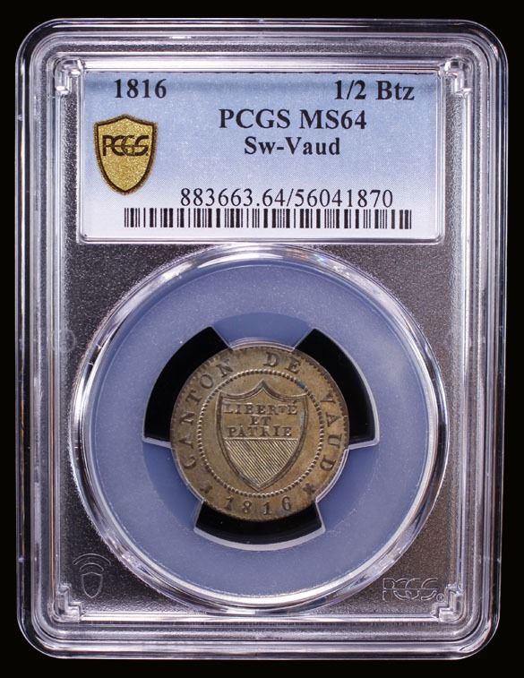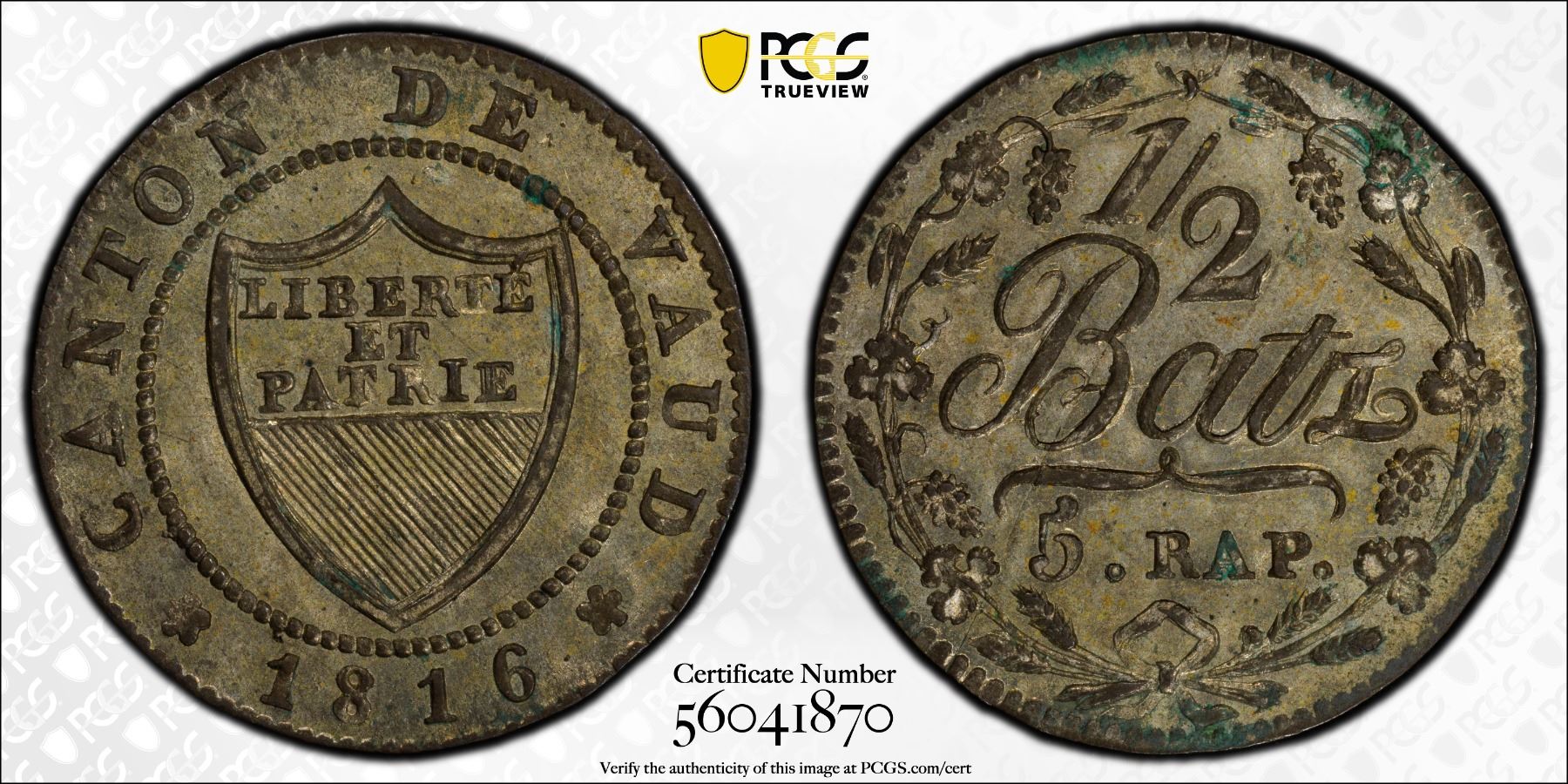 VAUD: Canton, BI 1/2 batzen, 1816, KM-6, C-3, a wonderful example, PCGS graded MS64.