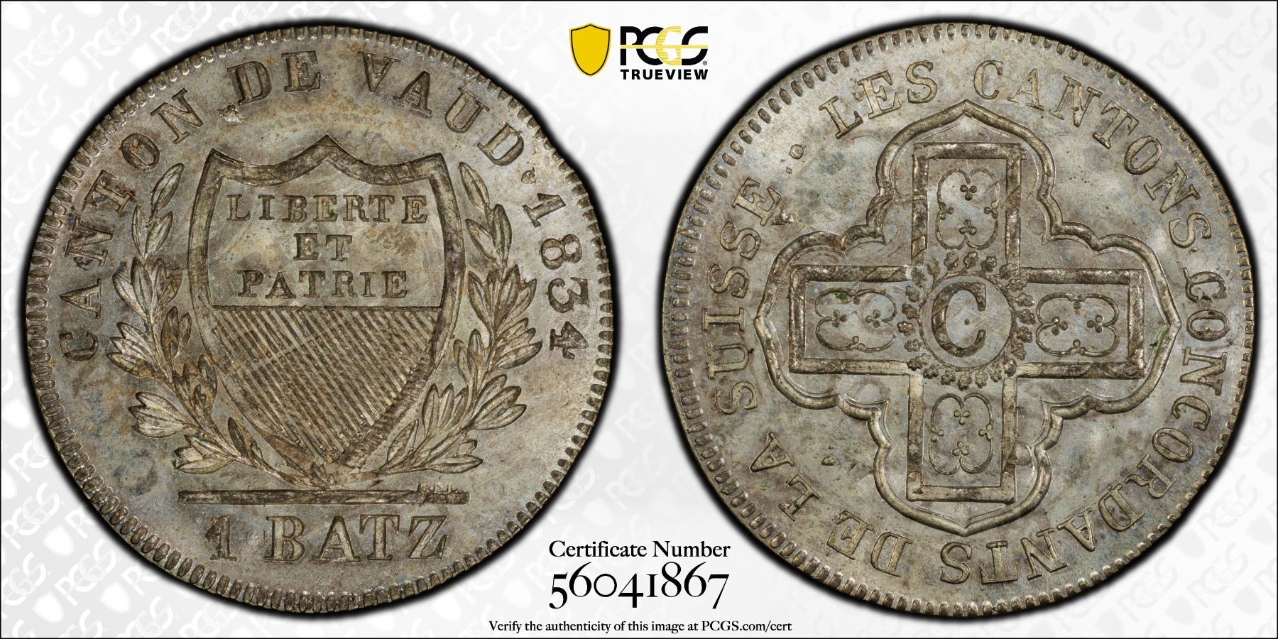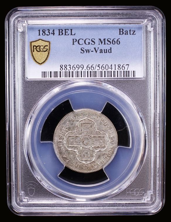 SWITZERLAND: VAUD: Canton, BI batzen, 1834, PCGS MS66