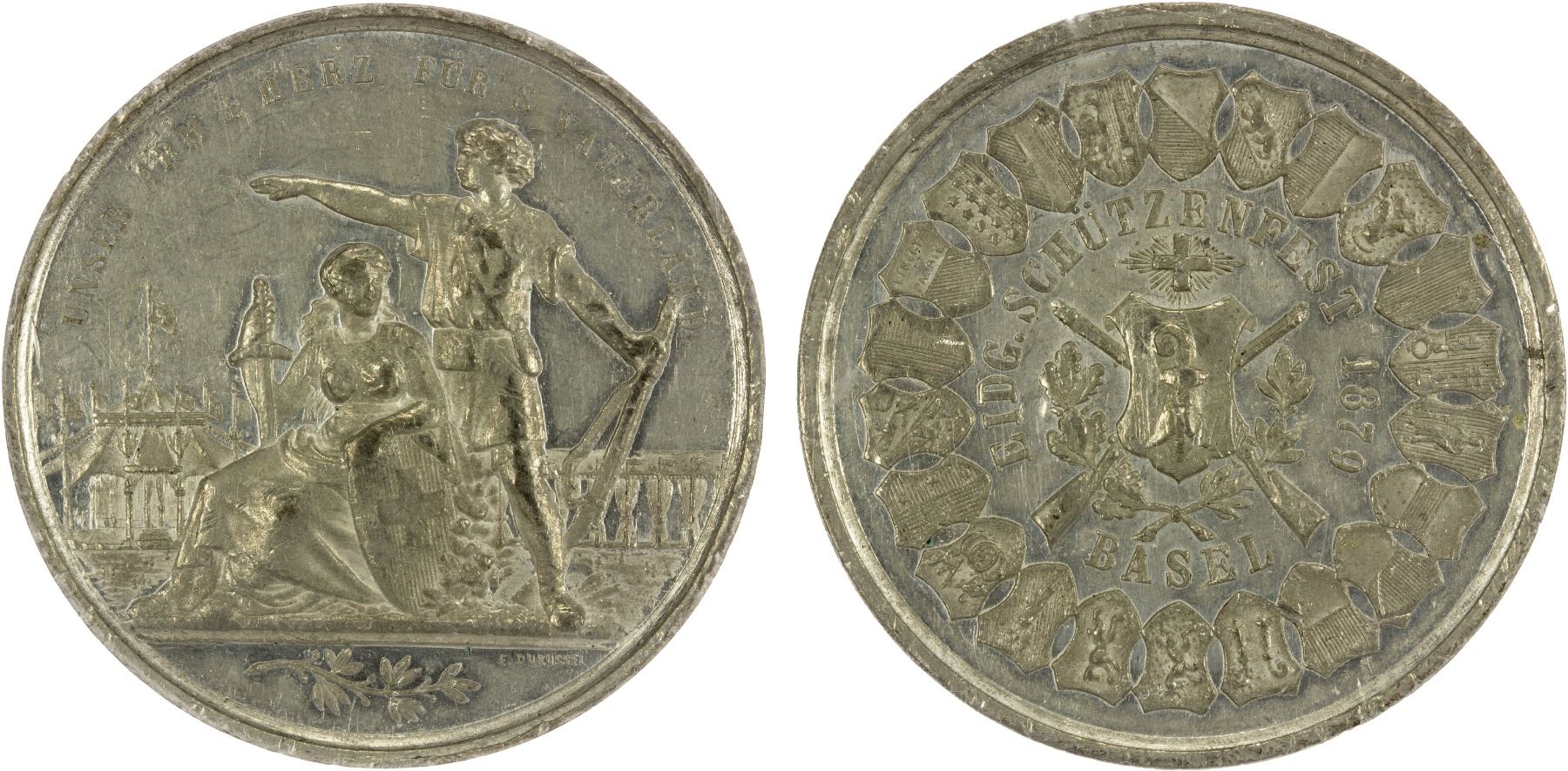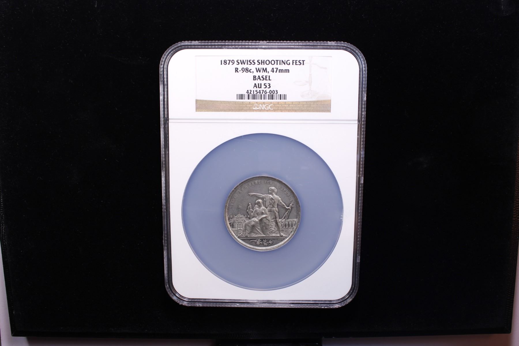 SWITZERLAND: white metal medal, 1879, Richter-98c, Martin-62, 47mm white metal medal; UNSER ARM & HERZ FÜR'S VATERLAND above young rifleman holding gesturing over seated figure of Helvetia // EIDG. SCHÜTZENFEST 1879 BASEL above coat of arms of Basel in front of crossed rifles, surrounded by 22 cantonal coats of arms, struck for the Federal Shooting Festival held in Bern Canton, NGC graded AU53.