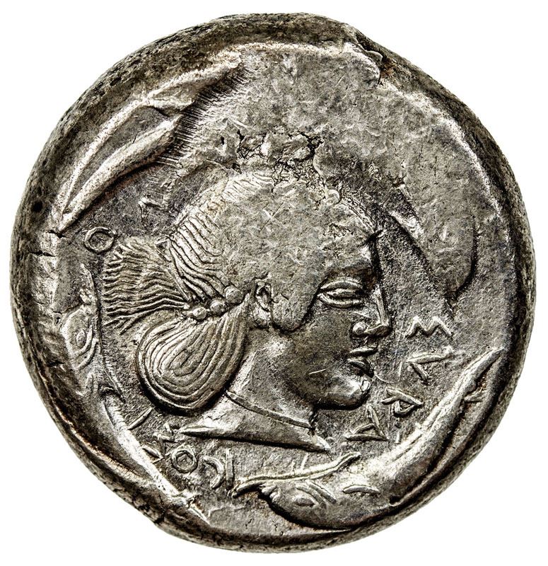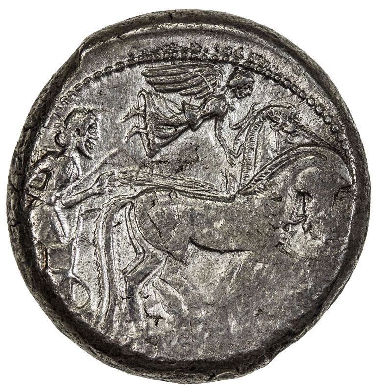 SYRACUSE: Gelon, 485-478 BC, AR tetradrachm (17.31g), S-913, slow quadriga right, driven by male charioteer holding goad, Nike flying above // large head of Artemis-Arethusa surrounded by city name and 4 dolphins, some weakness, VF, R.