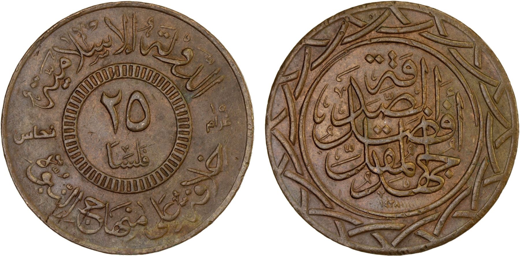 SYRIA: Islamic State, AE 25 fils (15.09g), AH1438, light type, denomination in center, al-dawlah al-islâmiyyah / khilâfatun 'alâ minhâji al-nabuwwah ("Islamic State / a caliphate upon the model of the Prophethood") in the margin, and "20 grams / 97.5 copper" across field // al-sadqa afdal jahd al-muqill ("The best charity is the effort of the poor"), date below, all within ornamental border, AU. The Islamic State gold dinar was the de-jure currency of the Islamic State from 2014 to 2019. It is also subdivided into silver dirhams and copper fulûs, and it has its origins in the historical gold dinar. In 2016 (AH1438), one gold dinar was exchanged for 190 U.S. dollars or 91 British pounds. A series of coins made up of gold 1, 2, and 5 dinars, silver 1, 2, and 5 dirhams, and copper 5, 10, and 25 fulûs were released as such. Despite the extensive promotion by the Islamic State of this coinage series, the currency only saw limited circulation in areas under their control. This item was originally produced by an organization associated with acts of violence, crimes against humanity, war crimes, extremism, human rights violations, or similar topics. Our firm does not endorse such activities and only offers this item as an artifact of history to further research and civil enlightenment.