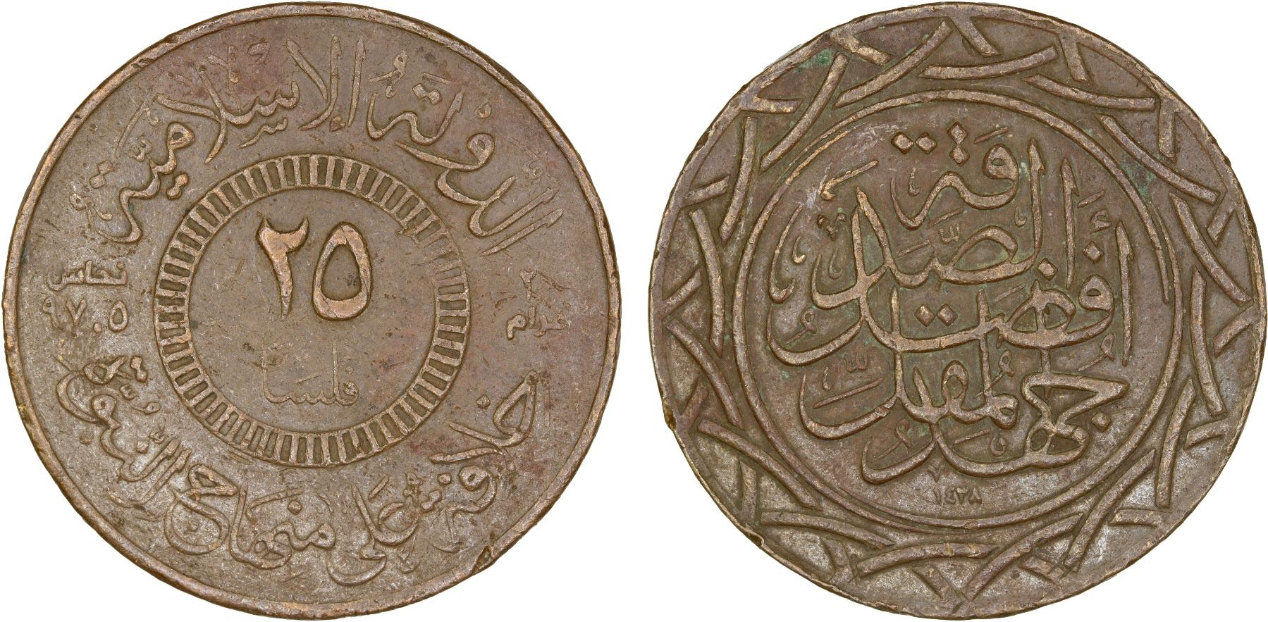 SYRIA: Islamic State, AE 25 fils, AH1438, heavy type, denomination in center, al-dawlah al-islâmiyyah / khilâfatun 'alâ minhâji al-nabuwwah ("Islamic State / a caliphate upon the model of the Prophethood") in the margin, and "20 grams / 97.5 copper" across field // afdalu al-sadaqah juhdu al-muqill ("The best charity is the effort of the poor"), date below, all within ornamental border, Choice XF. The Islamic State gold dinar was the de-jure currency of the Islamic State from 2014 to 2019. It is also subdivided into silver dirhams and copper fulus, and it has its origins in the historical gold dinar. In 2016 (AH1438), one gold dinar was exchanged for 190 U.S. dollars or 91 British pounds. A series of coins made up of gold 5, 2, and 1 dinars, silver 5, 2, and 1 dirhams, and copper 25, 10 and 5 fulus were released as such. Despite the extensive promotion of the Islamic State in this coinage series, the currency only saw limited circulation in areas under their control.