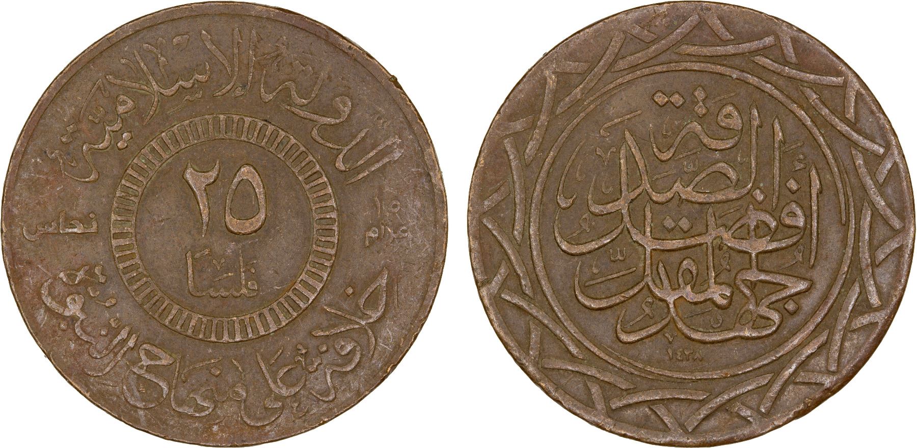 SYRIA: Islamic State, AE 25 fils, AH1438, light type, denomination in center, al-dawlah al-islâmiyyah / khilâfatun 'alâ minhâji al-nabuwwah ("Islamic State / a caliphate upon the model of the Prophethood") in the margin, and "15 grams / copper" across field // afdalu al-sadaqah juhdu al-muqill ("The best charity is the effort of the poor"), date below, all within ornamental border, Choice XF The Islamic State gold dinar was the de-jure currency of the Islamic State from 2014 to 2019. It is also subdivided into silver dirhams and copper fulûs, and it has its origins in the historical gold dinar. In 2016 (AH1438), one gold dinar was exchanged for 190 U.S. dollars or 91 British pounds. A series of coins made up of gold 5, 2, and 1 dinar, silver 5, 2, and 1 dirham, and copper 25, 10 and 5 fulûs were released as such. Despite the extensive promotion of the Islamic State in this coinage series, the currency only saw limited circulation in areas under their control. This item was originally produced by a regime which perpetrated crimes against humanity, war crimes, mass murder, and other acts of violence. Our firm does not endorse such activities and only offers this item as an artifact of history to further research and civil enlightenment.