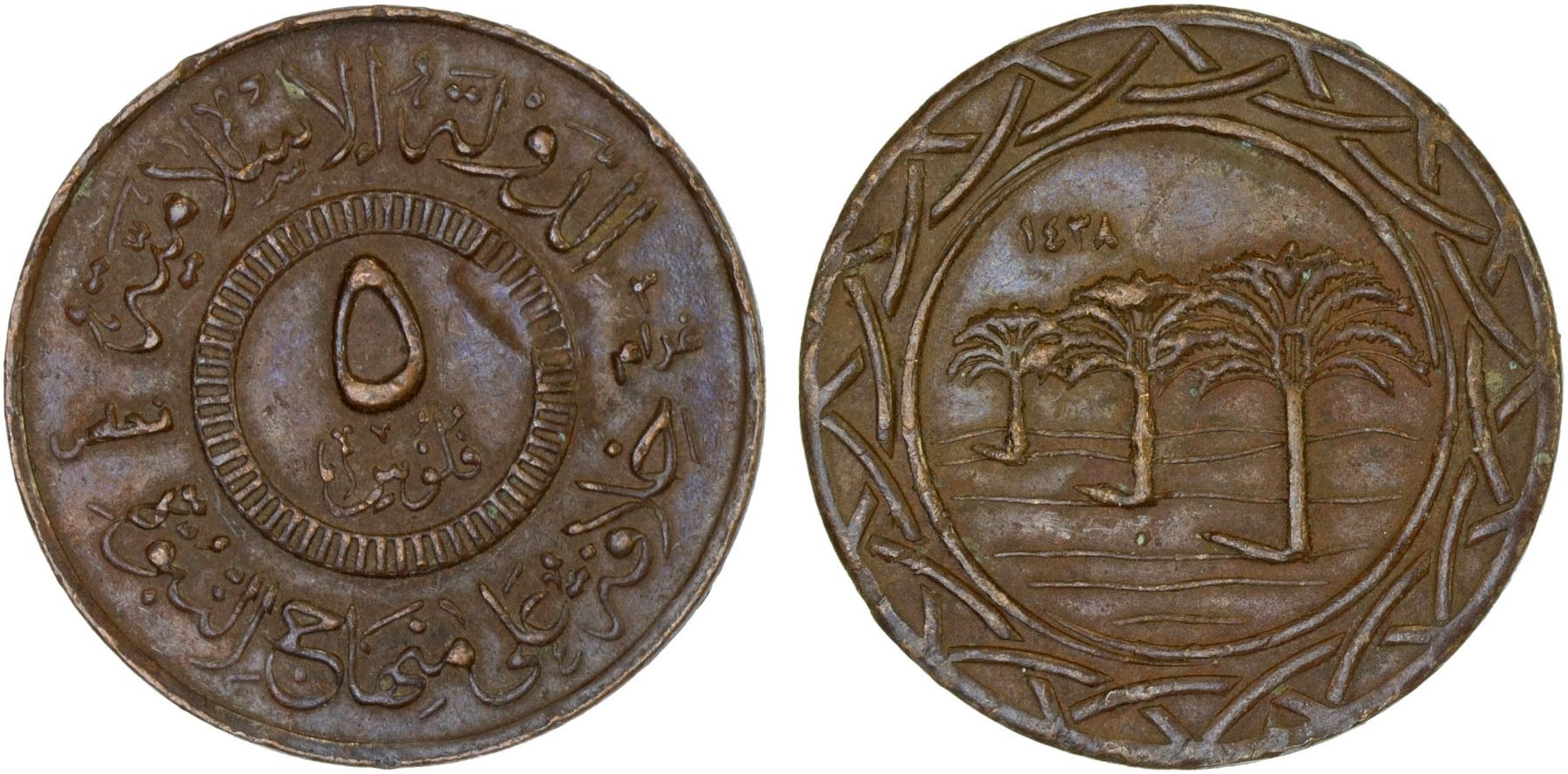 SYRIA: Islamic State, AE 5 fils, AH1438, denomination in center, al-dawlah al-islâmiyyah / khilâfatun 'alâ minhâji al-nabuwwah ("Islamic State / a caliphate upon the model of the Prophethood") in the margin, and "3 grams / copper" across field // three palm trees, date above, all within ornamental border, AU. The Islamic State gold dinar was the de-jure currency of the Islamic State from 2014 to 2019. It is also subdivided into silver dirhams and copper fulûs, and it has its origins in the historical gold dinar. In 2016 (AH1438), one gold dinar was exchanged for 190 U.S. dollars or 91 British pounds. A series of coins made up of gold 5, 2, and 1 dinar, silver 5, 2, and 1 dirham, and copper 25, 10 and 5 fulûs were released as such. Despite the extensive promotion of the Islamic State in this coinage series, the currency only saw limited circulation in areas under their control. This item was originally produced by an organization associated with acts of violence, crimes against humanity, war crimes, extremism, human rights violations, or similar topics. Our firm does not endorse such activities and only offers this item as an artifact of history to further research and civil enlightenment.