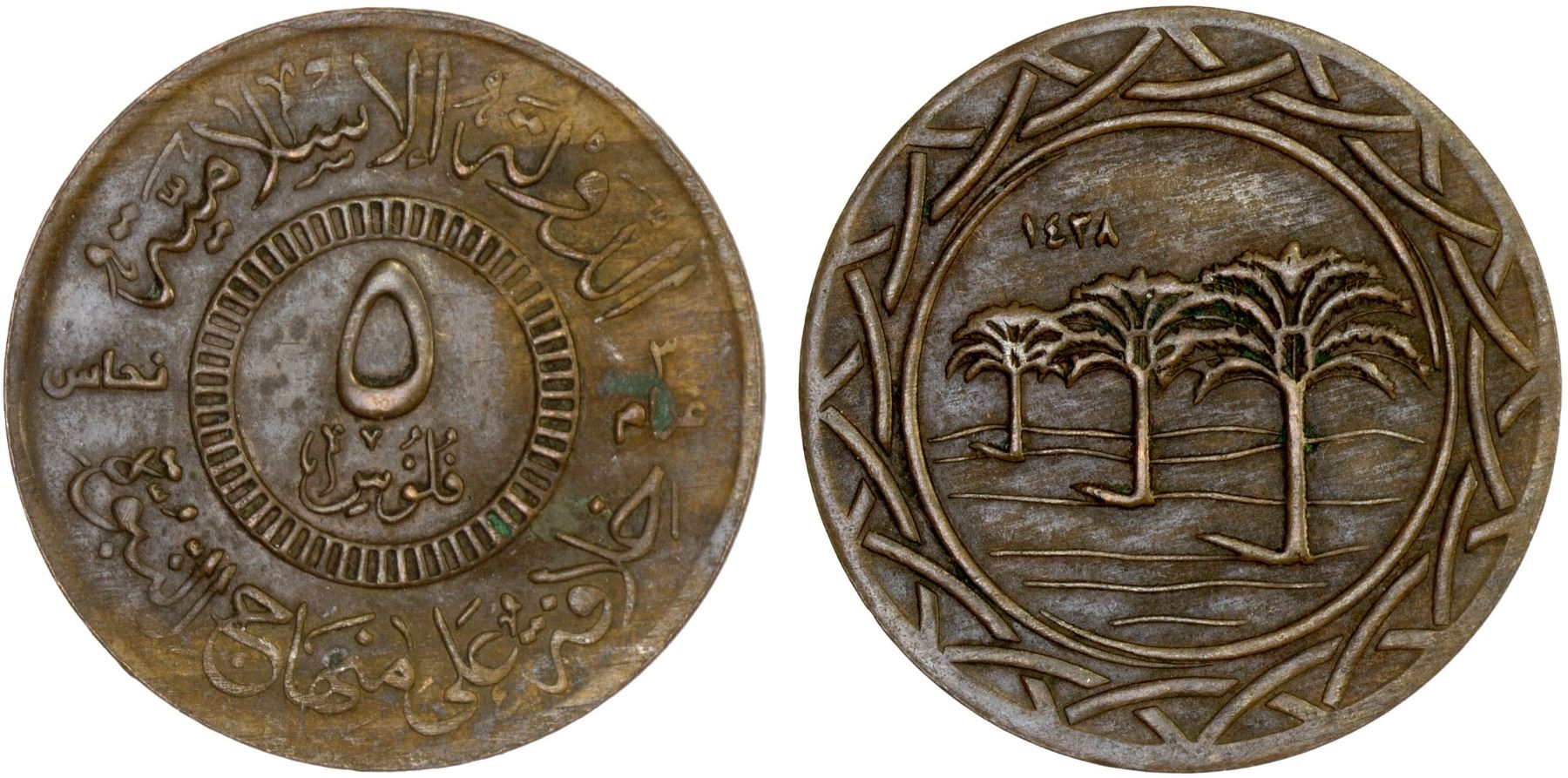 SYRIA: Islamic State, AE 5 fils, AH1438, denomination in center, al-dawlah al-islâmiyyah / khilâfatun 'alâ minhâji al-nabuwwah ("Islamic State / a caliphate upon the model of the Prophethood") in the margin, and "3 grams / copper" across field // three palm trees, date above, all within ornamental border, XF. The Islamic State gold dinar was the de-jure currency of the Islamic State from 2014 to 2019. It is also subdivided into silver dirhams and copper fulûs, and it has its origins in the historical gold dinar. In 2016 (AH1438), one gold dinar was exchanged for 190 U.S. dollars or 91 British pounds. A series of coins made up of gold 5, 2, and 1 dinar, silver 5, 2, and 1 dirham, and copper 25, 10 and 5 fulûs were released as such. Despite the extensive promotion of the Islamic State in this coinage series, the currency only saw limited circulation in areas under their control. This item was originally produced by an organization associated with acts of violence, crimes against humanity, war crimes, extremism, human rights violations, or similar topics. Our firm does not endorse such activities and only offers this item as an artifact of history to further research and civil enlightenment.