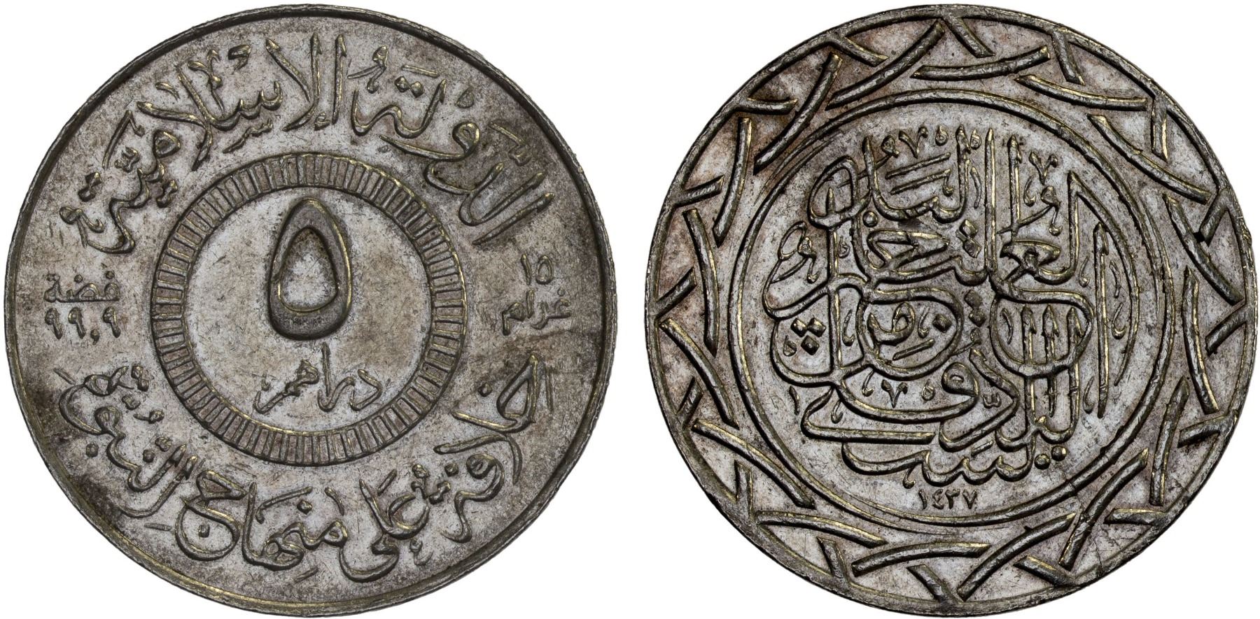 SYRIA: Islamic State, AR 5 dirhams (15.01g), AH1437, denomination in center, al-dawlah al-islâmiyyah / khilâfatun 'alâ minhâji al-nabuwwah ("Islamic State / a caliphate upon the model of the Prophethood") in the margin, and "15 grams / 99.9 silver" across field // al-yadu al-'ulyâ khayrun min al-yadi al-suflâ ("The upper hand is better than the lower hand"), date below, all within ornamental border, XF. The Islamic State gold dinar was the de-jure currency of the Islamic State from 2014 to 2019. It is also subdivided into silver dirhams and copper fulûs, and it has its origins in the historical gold dinar. In 2016 (AH1438), one gold dinar was exchanged for 190 U.S. dollars or 91 British pounds. A series of coins made up of gold 1, 2, and 5 dinars, silver 1, 2, and 5 dirhams, and copper 5, 10, and 25 fulûs were released as such. Despite the extensive promotion by the Islamic State of this coinage series, the currency only saw limited circulation in areas under their control. This item was originally produced by an organization associated with acts of violence, crimes against humanity, war crimes, extremism, human rights violations, or similar topics. Our firm does not endorse such activities and only offers this item as an artifact of history to further research and civil enlightenment.