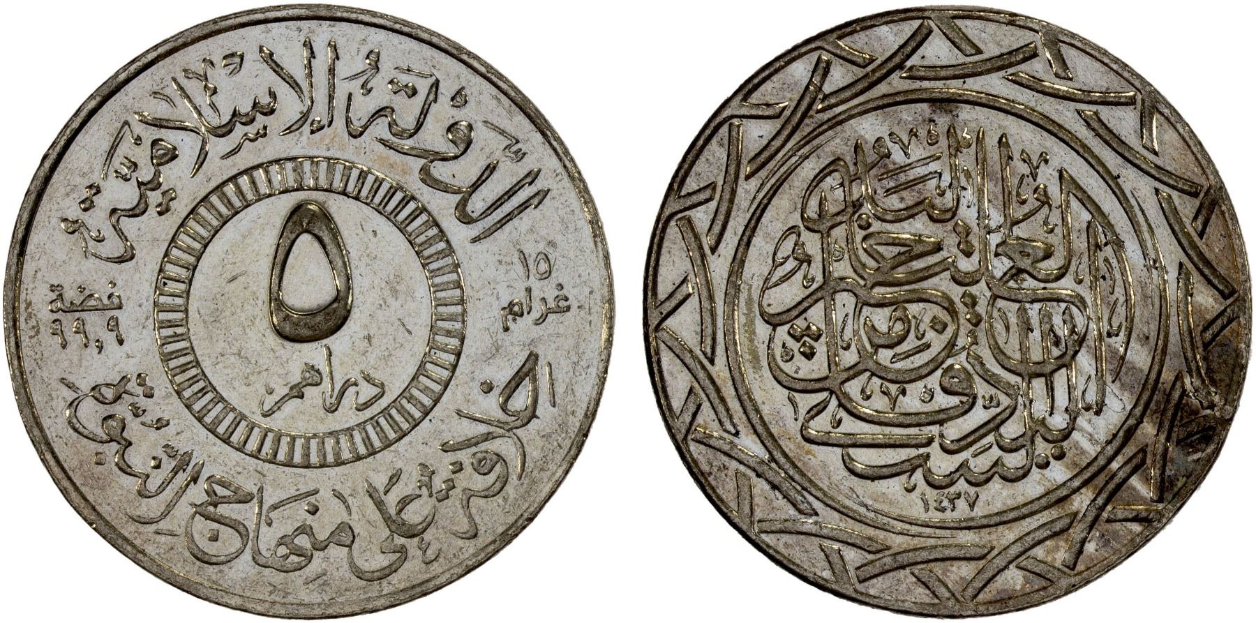 SYRIA: Islamic State, AR 5 dirhams, AH1437, denomination in center, al-dawlah al-islâmiyyah / khilâfatun 'alâ minhâji al-nabuwwah ("Islamic State / a caliphate upon the model of the Prophethood") in the margin, and "15 grams / 99.9 silver" across field // al-yadu al-'ulyâ khayrun min al-yadi al-suflâ ("The upper hand is better than the lower hand"), date below, all within ornamental border, brilliant luster, Unc. The Islamic State gold dinar was the de-jure currency of the Islamic State from 2014 to 2019. It is also subdivided into silver dirhams and copper fulûs, and it has its origins in the historical gold dinar. In 2016 (AH1438), one gold dinar was exchanged for 190 U.S. dollars or 91 British pounds. A series of coins made up of gold 5, 2, and 1 dinar, silver 5, 2, and 1 dirham, and copper 25, 10 and 5 fulûs were released as such. Despite the extensive promotion of the Islamic State in this coinage series, the currency only saw limited circulation in areas under their control. This item was originally produced by an organization associated with acts of violence, crimes against humanity, war crimes, extremism, human rights violations, or similar topics. Our firm does not endorse such activities and only offers this item as an artifact of history to further research and civil enlightenment.