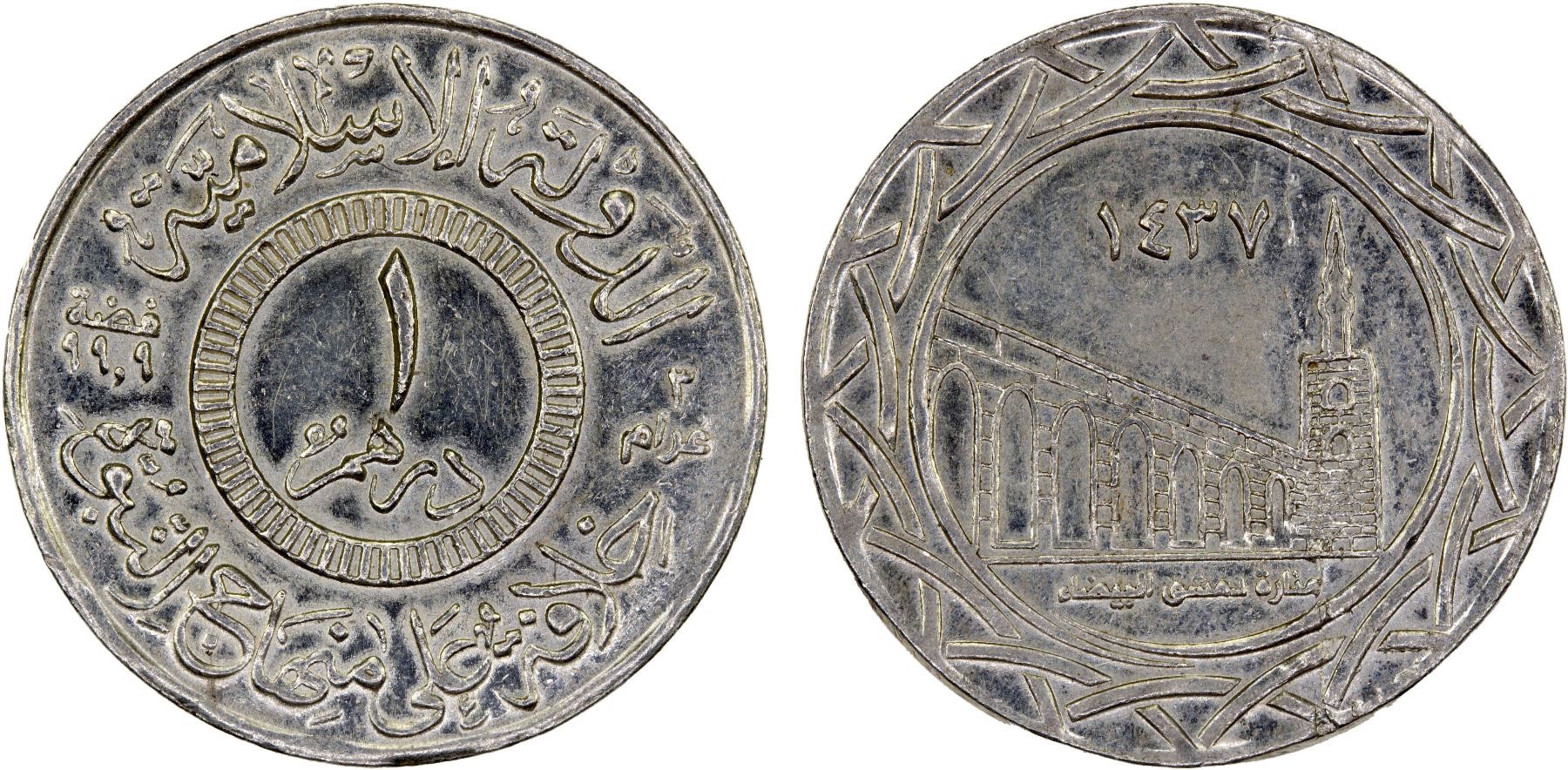 SYRIA: Islamic State, AR dirham, AH1437, denomination in center, al-dawlah al-islâmiyyah / khilâfatun 'alâ minhâji al-nabuwwah ("Islamic State / a caliphate upon the model of the Prophethood") in the margin, and "3 grams / 99.9 silver" across field // minârah dimashq al-baydâ' ("the white minaret of Damascus") and view of the mosque, date above, all within ornamental border, die break on reverse, faint hairlines, UNC The Islamic State gold dinar was the de-jure currency of the Islamic State from 2014 to 2019. It is also subdivided into silver dirhams and copper fulûs, and it has its origins in the historical gold dinar. In 2016 (AH1438), one gold dinar was exchanged for 190 U.S. dollars or 91 British pounds. A series of coins divided between gold 5, 2, and 1 dinars, silver 5, 2, and 1 dirhams and copper 25, 10 and 5 fulûs were released as such. Despite the extensive promotion of the Islamic State in this coinage series, the currency only saw limited circulation in areas under their control.