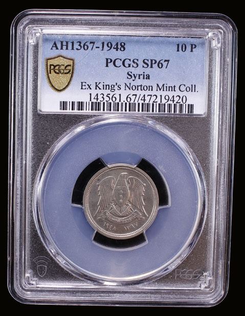 SYRIA: Republic, 10 piastres, 1948/AH1367, KM-83, only 15 examples known, very rare, wonderful luster, PCGS graded Specimen 67, ex King's Norton Mint Collection.