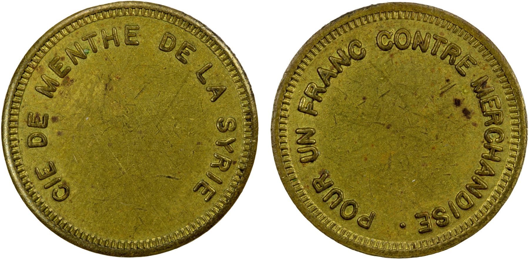 SYRIA: token (4.61g), ND (ca. 1950), Lecompte-50, brass token, CIE DE MENTHE DE LA SYRIE around blank center / POUR UN FRANC CONTRE MERCHANDISE. around blank center, a few minor small spots, EF, R, ex R. Merlin Null Collection, ex SARC Auction 20 (Lot 2138).