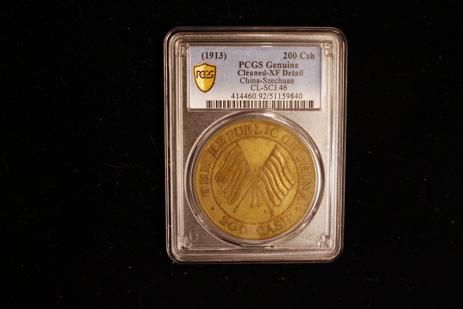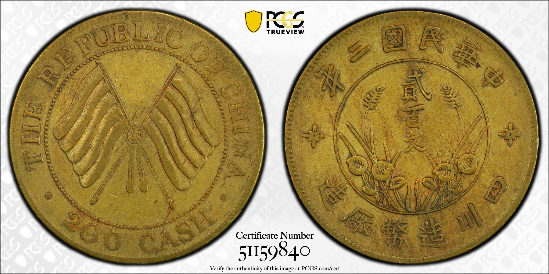 SZECHUAN: Republic, AE 200 cash, year 2 (1913), Y-459a, CL-SCJ.46, crossed Five-colored flags, variety struck in brass with short tassels, cleaned, PCGS graded XF details.