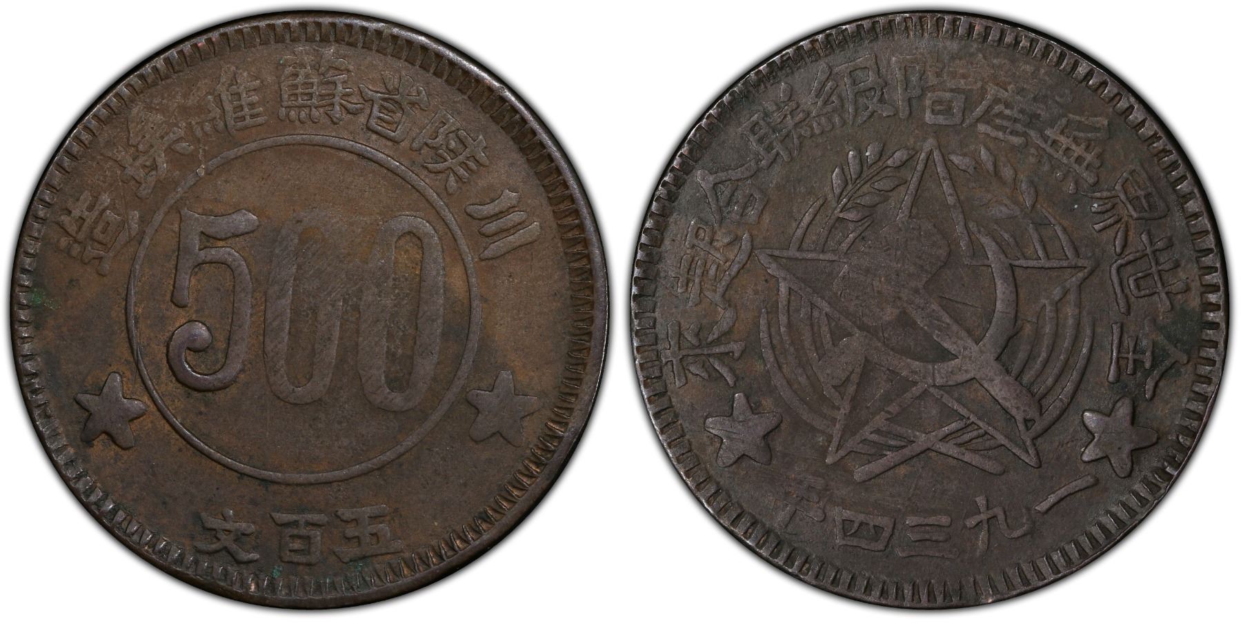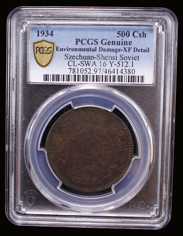 SZECHUAN-SHENSI SOVIET: AE 500 cash, 1934, Y-512.1, CL-SWA.16, hammer and sickle over star and wreath, variety with large stars flanking date, light hairlines on obverse, some discoloration on reverse, PCGS graded XF details. The Szechuan-Shensi Soviet was part of the discontiguous territories of the Chinese Soviet Republic and was a state established in November 1931 by the future Communist Party of China leader Mao Zedong, General Zhu De and others, and lasted until 1937.