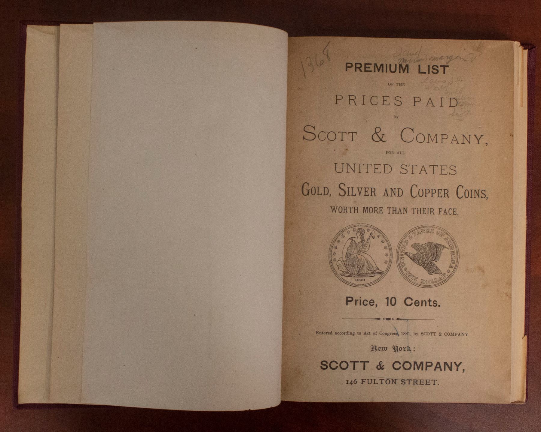 Scott, John Walter, Standard Coin Catalogue: Volumes 1 & 2, Scott & Company, New York, No. 1, 1910, Silver and Gold Coins of the World, 184 pages. It has the Territorial private issues of gold coins between 1830 and 1862. Usually, prices were under a few dollars but the Molitor San Francisco in fine condition was already at $50. Civil War 1864 proof sets with all nine pieces were available at $15. Many of the rarest items are left blank since none had come to market in the past 25 years (1885-1910). While the prices will amuse the modern collector, they do contain important information which will be useful, hardcover bound together with No. 2 The Copper Coins of the World Including Lead, Brass and Nickel, to Which has been Added a Full Line of the Roman Emperors. John Walter Scott (1845-1919) was given the appellation "Father of American Philately," he was also a prominent New York based coin dealer.