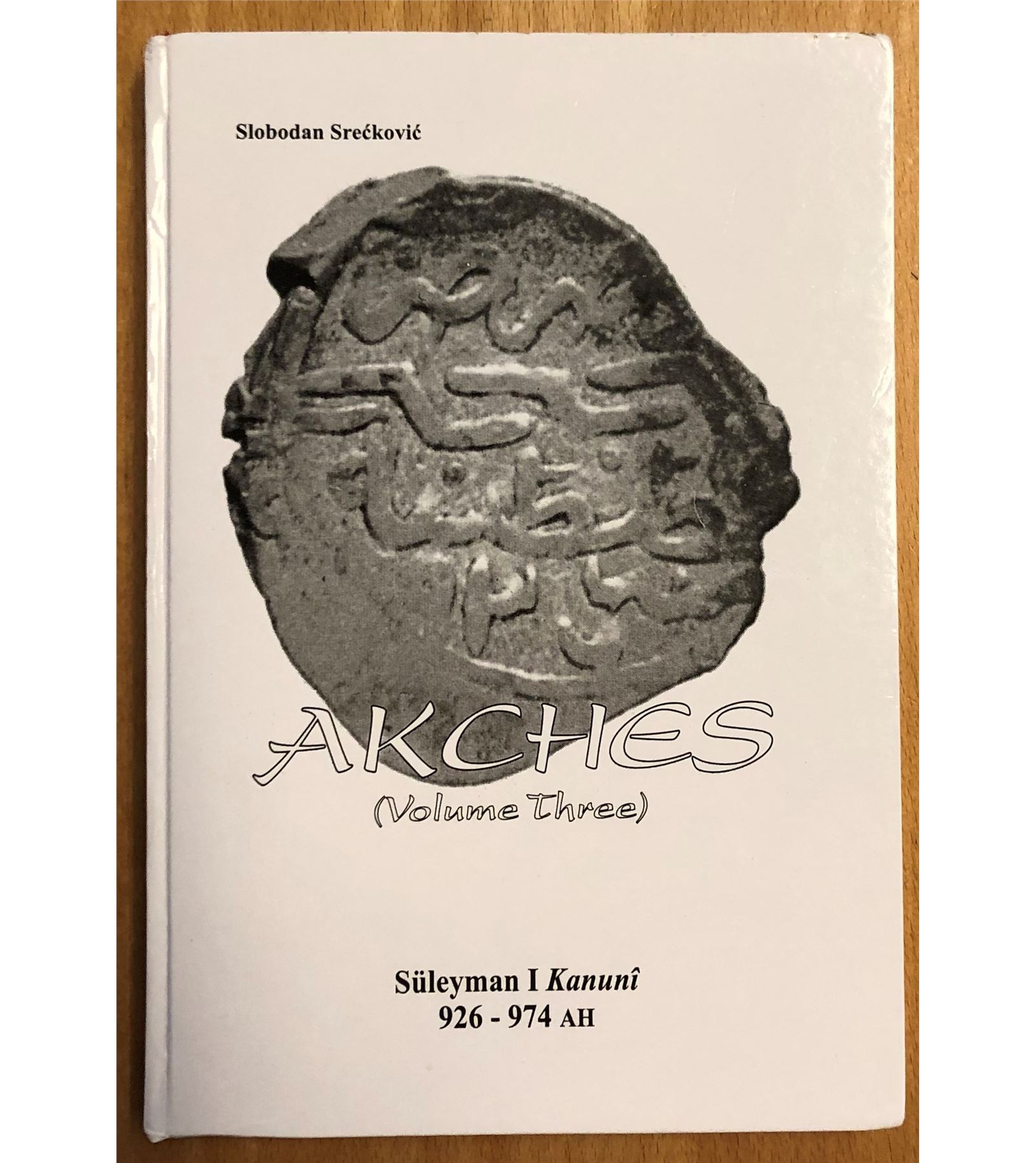 Sreckovic, Slobodan, Akches (Volume Three): Suleyman I Kanuni, 926-974 AH, Published by the author, Belgrade, 2003, 241 pages, 55 plates, hardcover. The third volume in the author 's sequential treatment of the complicated series of Ottoman akches. This volume is devoted to the lengthy reign of Sulayman the Magnificent and is as impressive as the earlier two volumes, ex James Farr Collection Library.