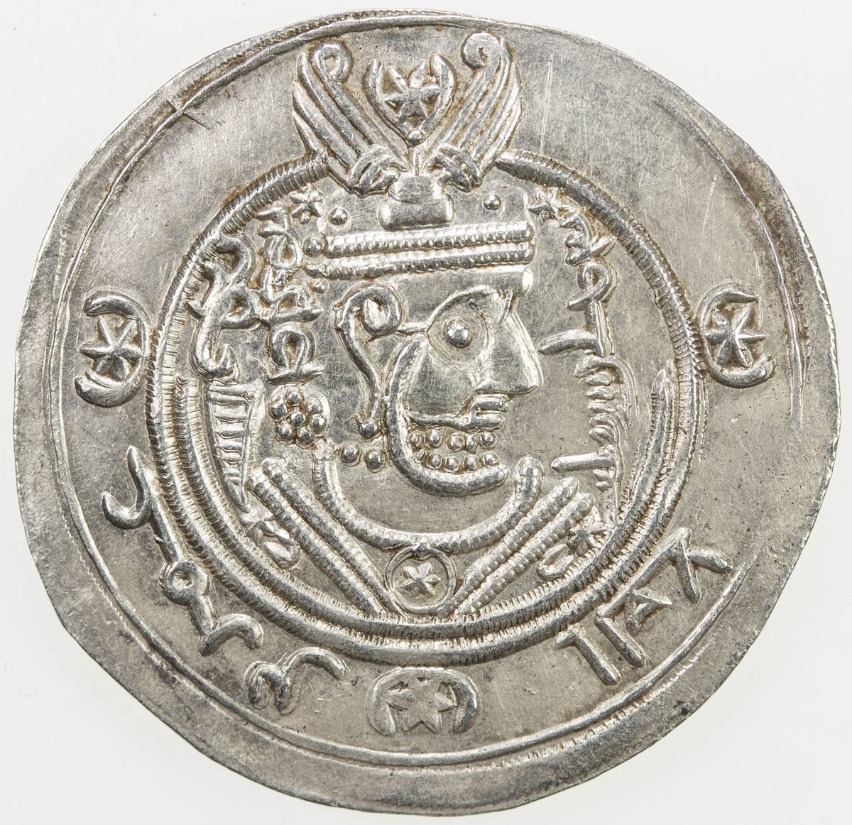 TABARISTAN: 'Umar, 771-780, AR ½ dirham (1.99g), Tabaristan, PYE125, A-57, governor's name in Pahlavi before bust & in Arabic in margin, both languages citing the patronymic (ibn al-'alâ), from recent hoard, bold strike, Unc.