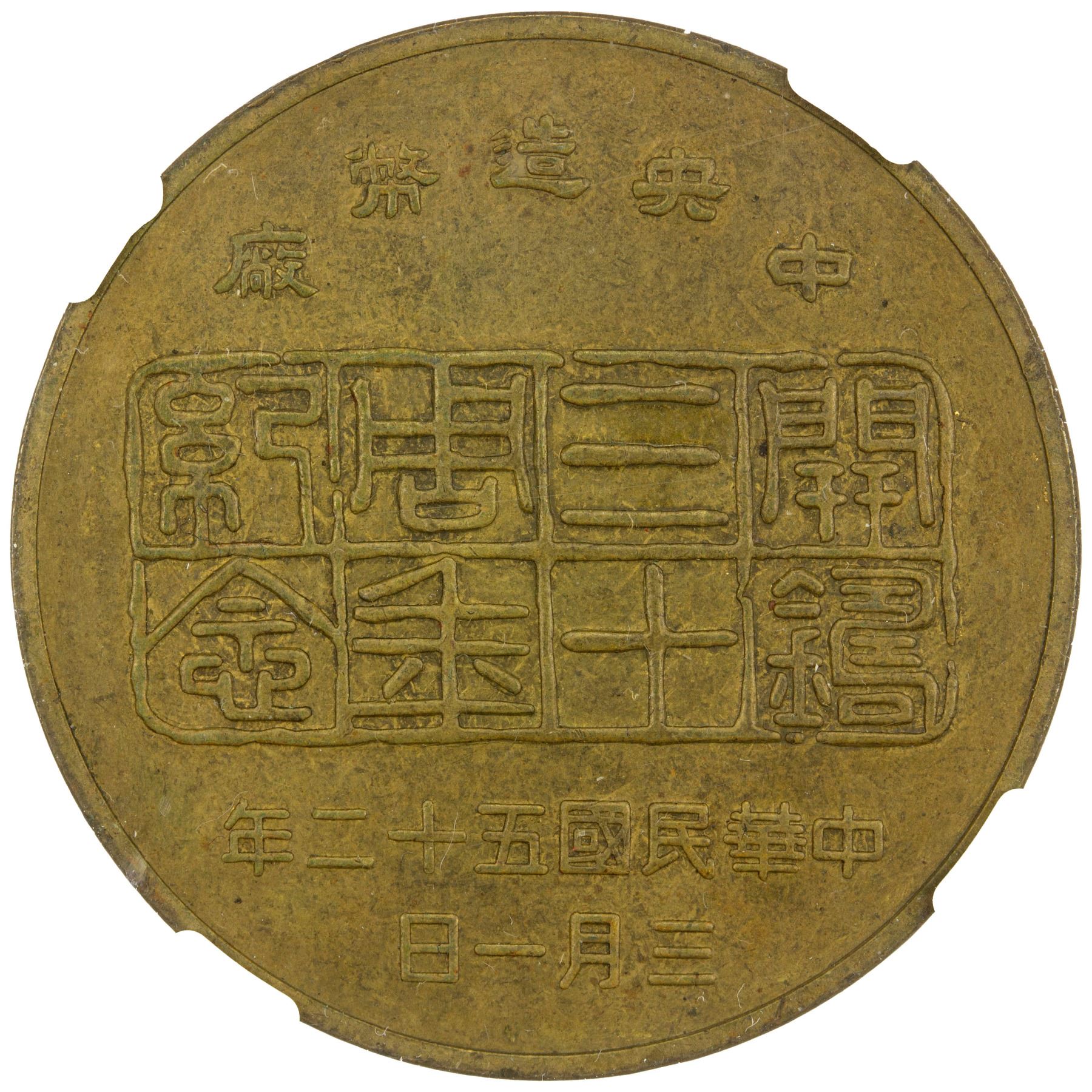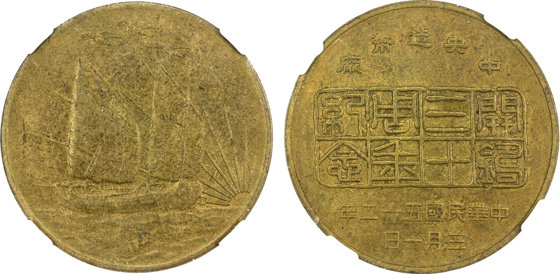 TAIWAN: Republic, brass medal, year 52 (1963), KM-X1170, L&M-1004, 30th Anniversary of the Central Mint with 'Birds over Junk" dollar reverse, NGC graded AU55.