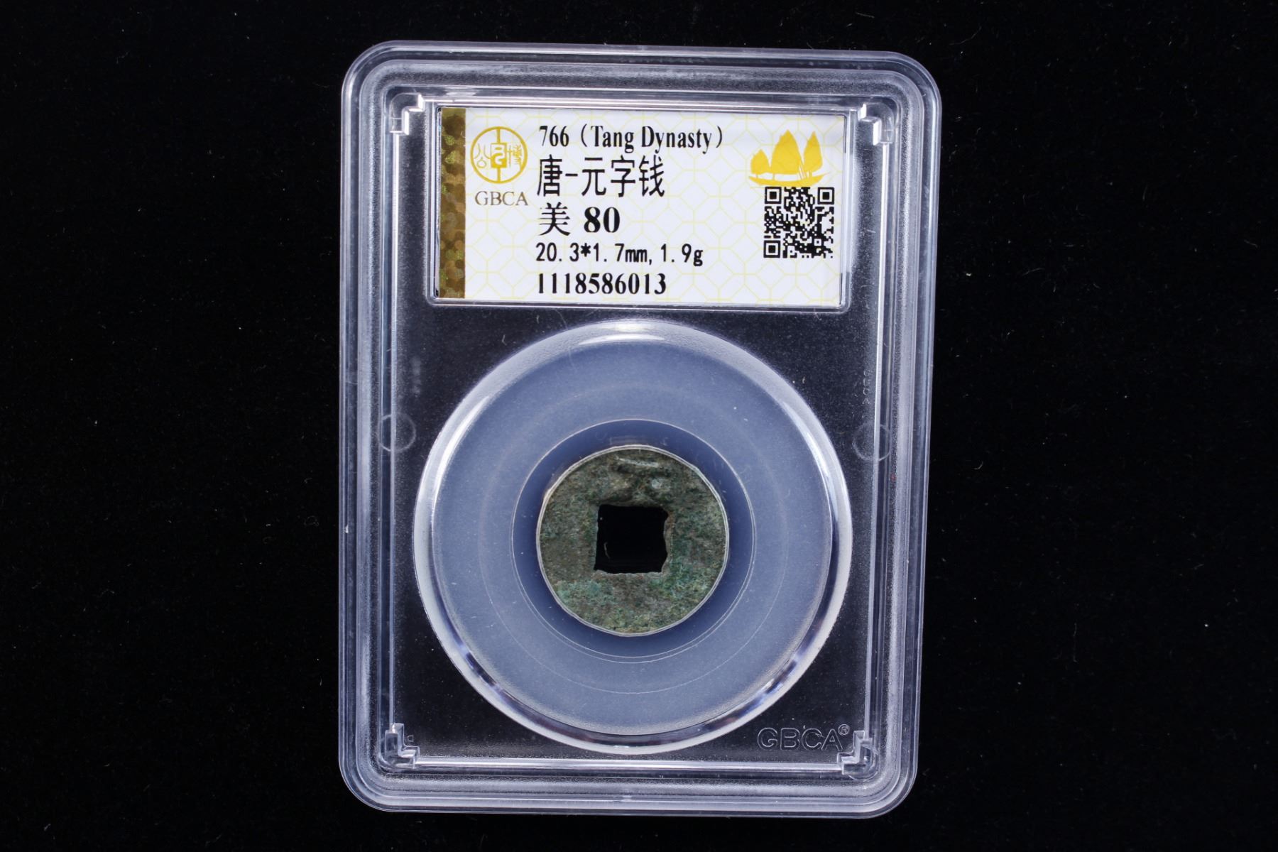 TANG: Dai Zong, 766-779, AE cash (1.9g), H-14.132A, character yuan at top, graded 80 by GBCA Grading Company, VF, ex Dr. Dirk Löer Collection. Judging by their find spots, these coins were likely cast by the local government in the Kuche area of Xinjiang in around 760-780.