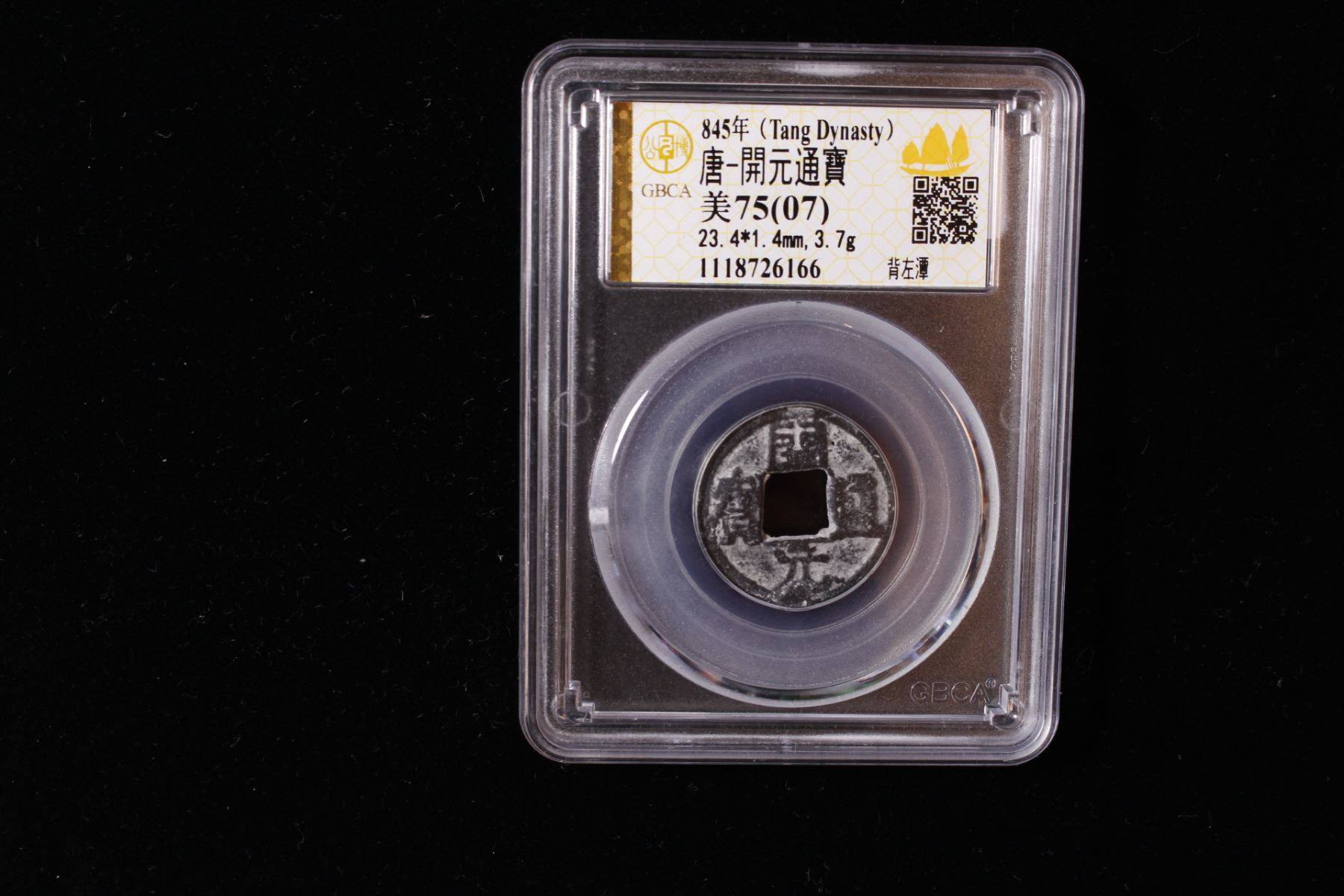 TANG: Kai Yuan, 845-846, AE cash (3.7g), Fuzhou mint, Fujian Province, H-14.57A, fu at left on reverse, graded 75(07) by GBCA Grading Company, natural casting defects, Fine, ex Dr. Dirk Löer Collection. Huichang Kaiyuan Tongbao cash coins are a series of Kaiyuan Tongbao coins produced under Emperor Wuzong who was a devout Taoist and used the reign era name of Huìchang. During his 5th year of reign (845) Emperor Wuzong ordered the casting of new coins with the inscription Kaiyuan Tongbao to be manufactured of bronze acquired by melting confiscated statues, copper bells, gongs, incense burners, and other copper items from Buddhist temples. These local mints were under the control of the provincial governors. The New Tang History states that Li Shen, governor of Huainan province, requested that the empire might cast coins bearing the name of the prefecture in which they were cast, and this was agreed. These Kaiyuan Tongbao cash coins differed from earlier variants due to the fact that they had a mint name character on their reverse side and eventually 23 mints produced Kaiyuan Tongbao coins with their own mint marks. Huichang Kaiyuan Tongbao coins are also of inferior workmanship compared to earlier coins and are diminutive in size. When Emperor Emperor Xuanzong ascended to the throne in the year 846, the aforementioned policy was reversed, and the new coins were recast to make Buddhist statues.