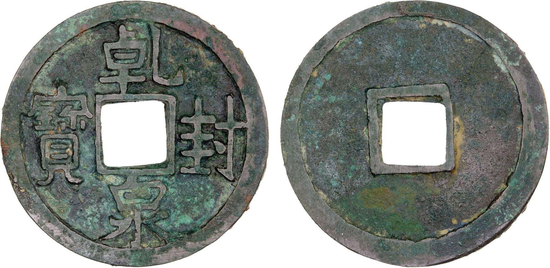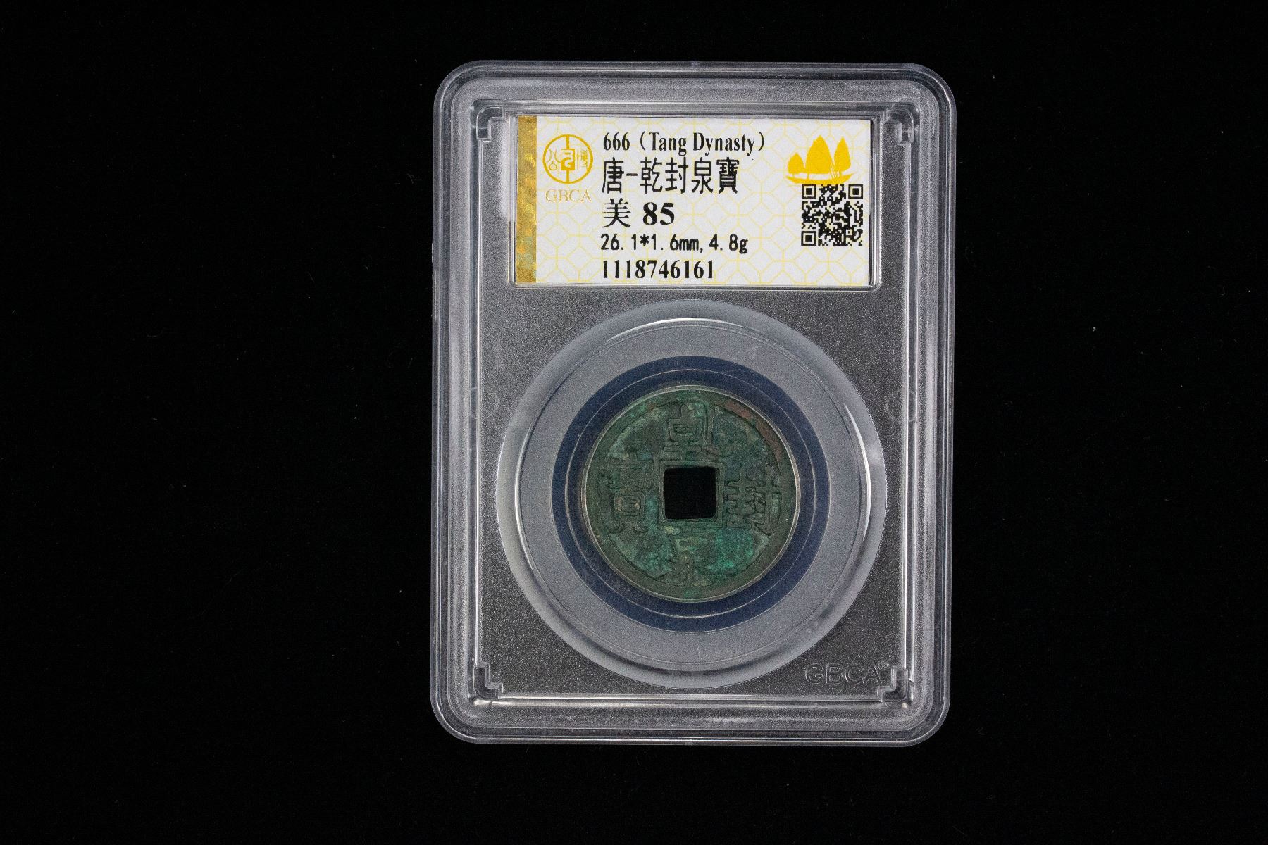 TANG: Qian Feng, 649-683, AE cash (4.8g), H-14.100, qián feng quán bao, graded 85 by GBCA Grading Company, XF, ex Dr. Dirk Löer Collection, ex Beijing Poly international Auction, Item 1124. This type was cast by the Emperor Gao Zong in the year 666. In an attempt to overcome a shortage of copper, one of the "qian feng" coins was to be equivalent to ten old coins, although its weight of 2.4 zhu was the same as a one cash coin. This led to extensive forgery, and the coin was withdrawn after a year.