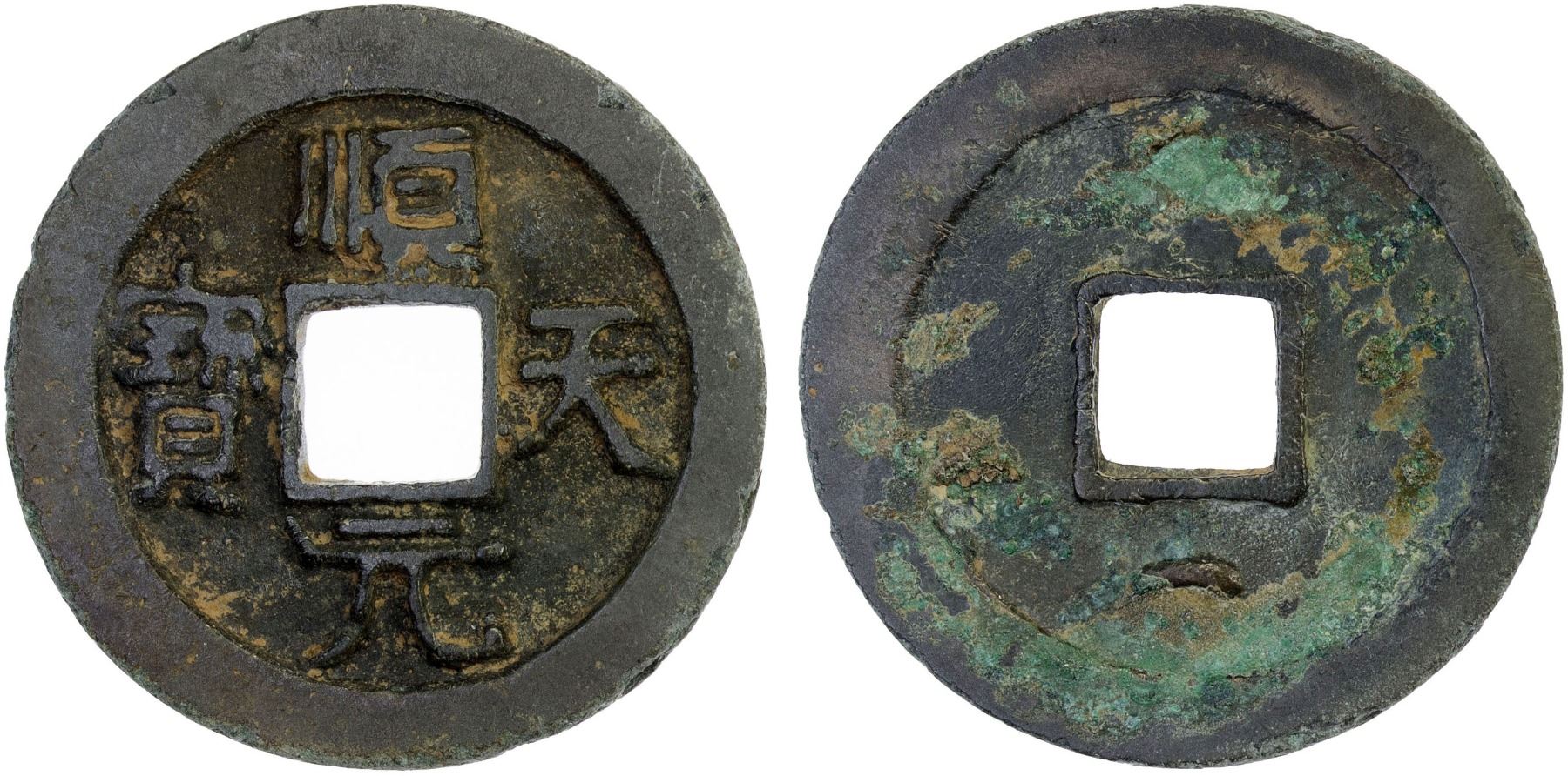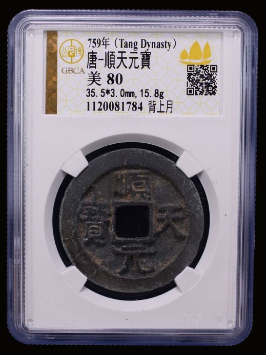 TANG: Shun Tian, Rebel, 759-761, AE 100 cash (15.8g), H-14.147, crescent above on reverse, graded 80 by GBCA Grading Company, VF, ex Stephen Album Auction 48, Lot 1339. Shi Siming (Shun Tian) was a general of Göktürk extraction of the Tang Dynasty who followed his childhood friend An Lushan in rebelling against Tang, and who later succeeded An Lushan's son An Qingxu as emperor of the Yan state that An Lushan had established. He was killed by his own troops in the spring of 761.