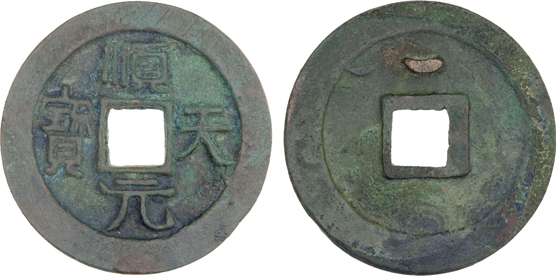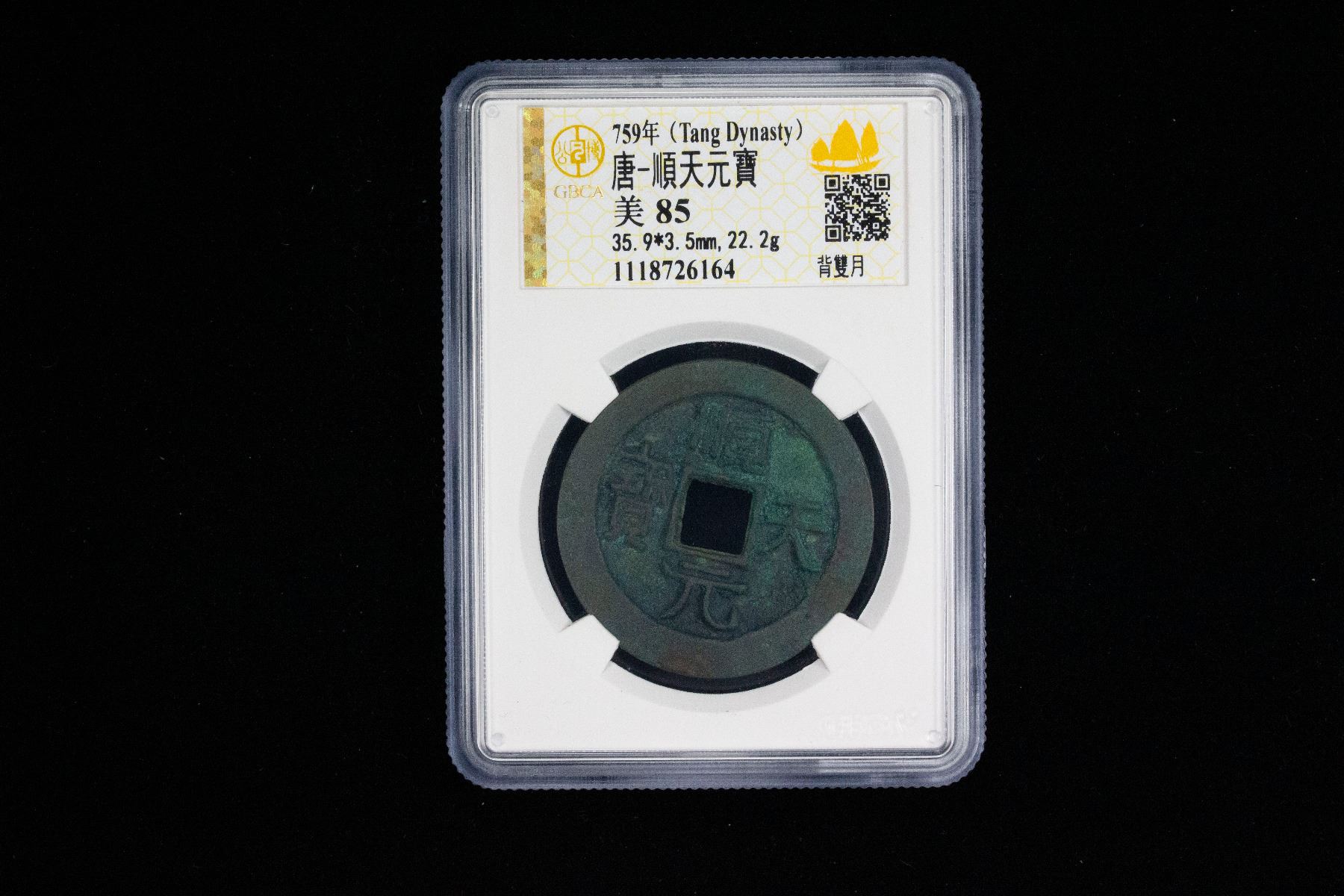 TANG: Shun Tian, Rebel, 759-761, AE 50 cash, H-14.147, crescent above on reverse, graded 85 by GBCA Grading Company, XF, ex Dr. Dirk Löer Collection. Shi Siming (Shun Tian) was a general of Göktürk extraction of the Tang Dynasty who followed his childhood friend An Lushan in rebelling against Tang, and who later succeeded An Lushan's son An Qingxu as emperor of the Yan state that An Lushan had established. He was killed by his own troops in the spring of 761.