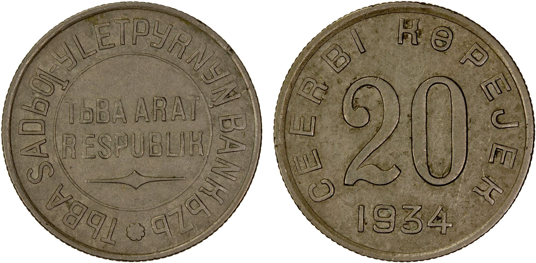 TANNU TUVA: 20 kopejek, 1934, KM-7, struck at the Leningrad Mint, light porosity, EF. The 1934 series uses a Latin-based alphabet, which was devised in 1930 by a Tuvan Buddhist monk, Mongush Lopsang-Chinmit. He was later executed in Stalinist purges on 31 December 1941, and the Latin script was replaced by a Cyrillic-based alphabet.