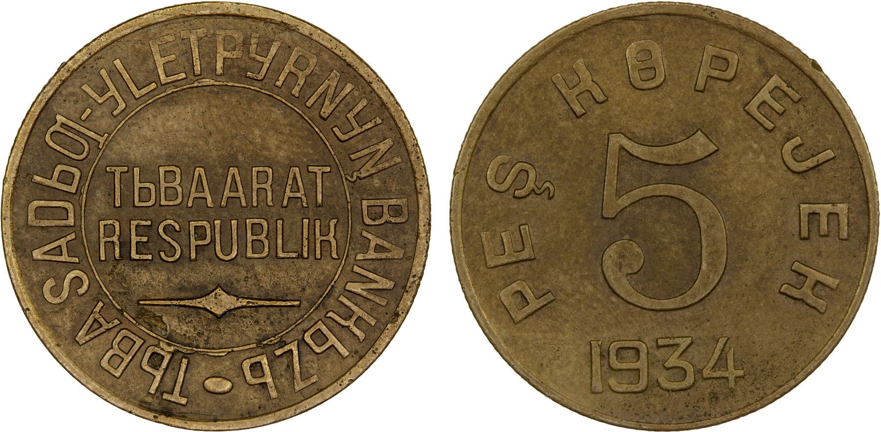 TANNU TUVA: AE 5 kopejek, 1934, KM-4, struck at the Leningrad Mint, a few small spots of corrosion, XF, ex Hans Mondorf Collection. The 1934 series uses a Latin-based alphabet, which was devised in 1930 by a Tuvan Buddhist monk, Mongush Lopsang-Chinmit. He was later executed in Stalinist purges on December 31, 1941, and the Latin script was replaced by a Cyrillic-based alphabet.