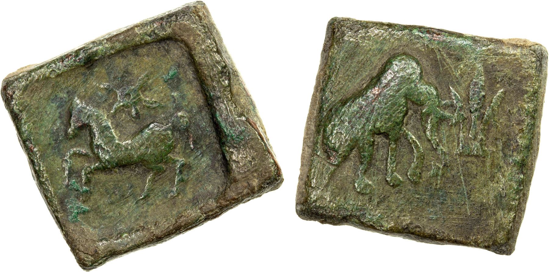 TAXILA: ca. 2nd/1st century BC, AE square unit (10.61g), Pieper-1500, horse, sun above // elephant, plant to right, VF, RR.
