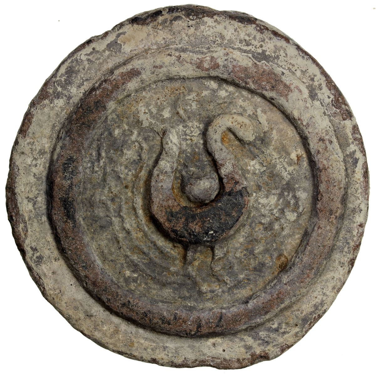 TENASSERIM-PEGU: Anonymous, 17th-18th century, lead weight (448g), Robinson Plate 5-6 (several types with identical obverse), 77mm; stylized hintha bird, with fancy tail, long beak, and curled crest, both feet clear // no traces of original Burmese-Mon legend, VF.