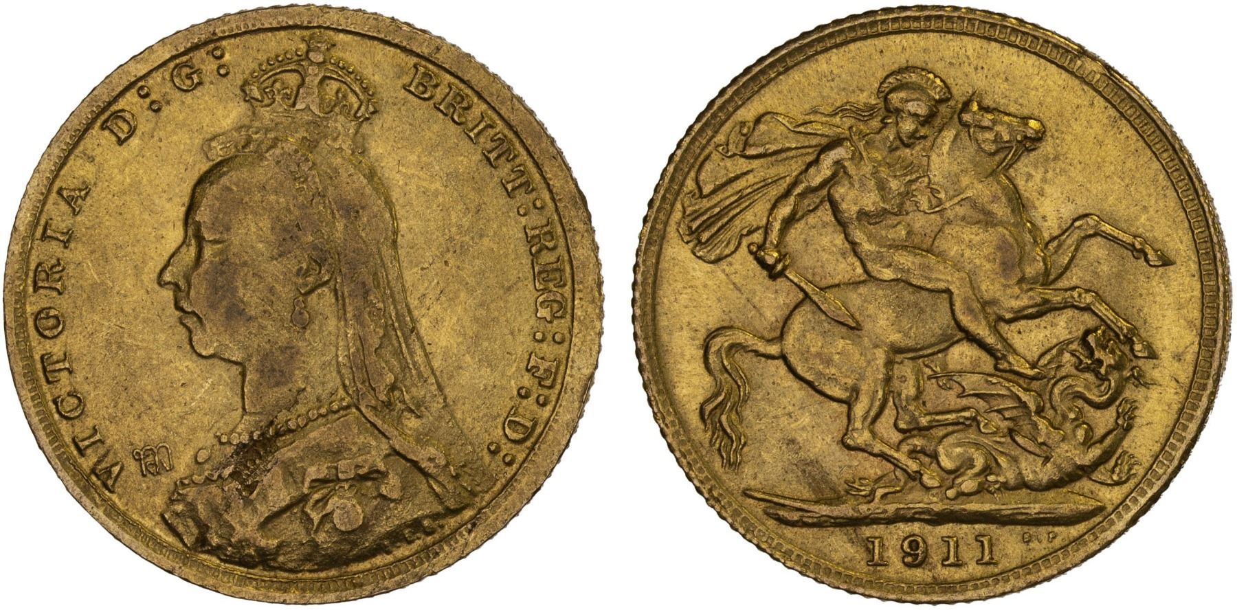 THAILAND: Jeweler's Issues, AV sovereign (8.06g), modern jeweler's issue imitating British gold type of Queen Victoria with date 1911, with small Thai jeweler's mark in lower obverse left field, very interesting! XF, ex Syed Rabbi Collection.