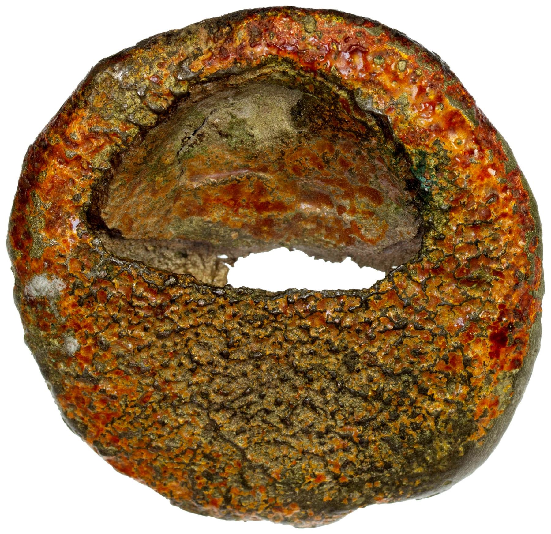 THAILAND: KINGDOMS: Lan Na, AR tok chiangmai (61.99g), ca. 17th-19th centuries, Mitch-2800var (counterstamps), 50mm, debased silver "oyster" tok coinage cast to the standard of one tamlung, two circular stamps with uncertain symbol on edge of obverse, XF. Chiang Mai Toks are usually found with a blackened top while the underside is yellowish-brown. This discoloration is traditionally attributed to the supposed mixing of the silver alloy with egg yolk and chicken blood. Krisadaolarn & Mihailovs, among many specialists, challenge this proposition and believe it was instead achieved by applying gold leaf to the obverse after production.