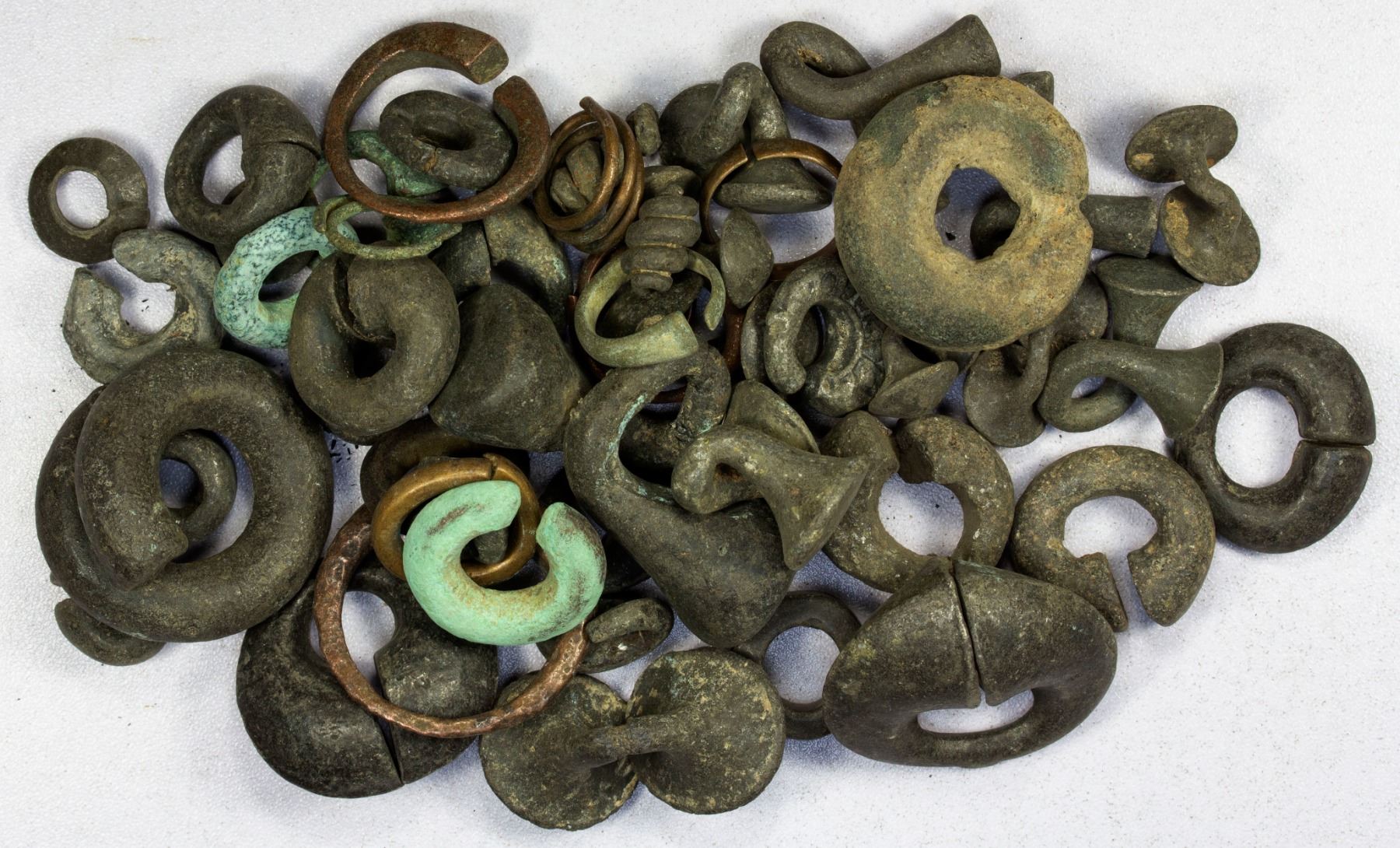 THAILAND - KINGDOMS: Lavapura, ca. 1050-1350, LOT of 49 ring money, also known in Malay as keloh or kelok, most in lead alloy with some in copper and brass, various shapes, with roughly a third bulbous end rings (cf. Mitch-2610-16), another third Zhenlifu (Suvarnapura) rings, and the remainder as plain rings and coils; a few quite large, the heaviest 75g; most in average conditions, most with some level of oxidation and porosity; retail value $500, lot of 49 pieces, ex Jürgen M. Wilmes Collection.