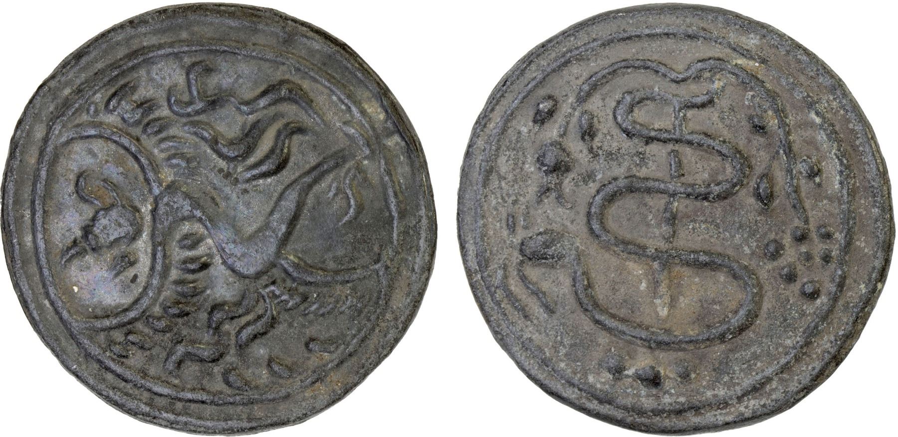 THAILAND: LIGOR: tin token (4.31g), 17th to early 20th century, Krisadaolarn & Mihailovs-D48, dancing Garuda right // Naga coiled around tree, Choice VF. Ligor is known as Nakhon Si Thammarat in Thai.