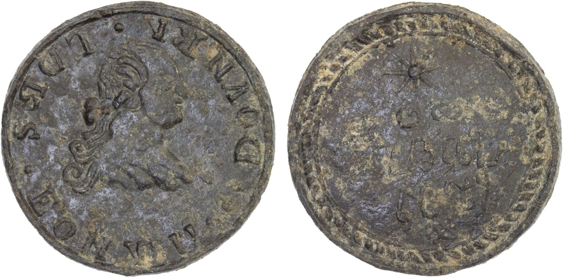 THAI PROVINCES: Chaiya, tin token (20.57g), Zeno--, Krisadaolarn--, obverse imitating Spanish colonial 8 reales of Carlos III or IV, with nonsensical Latin legend around bust // mueang chaiya in Thai script above a tentative date of 1314 (possibly in the Hijri era) in Thai numerals, star below, light spots of discoloration, Choice VF. Chaiya is one of the districts and a former capital of the southern Thai province of Surat Thani.