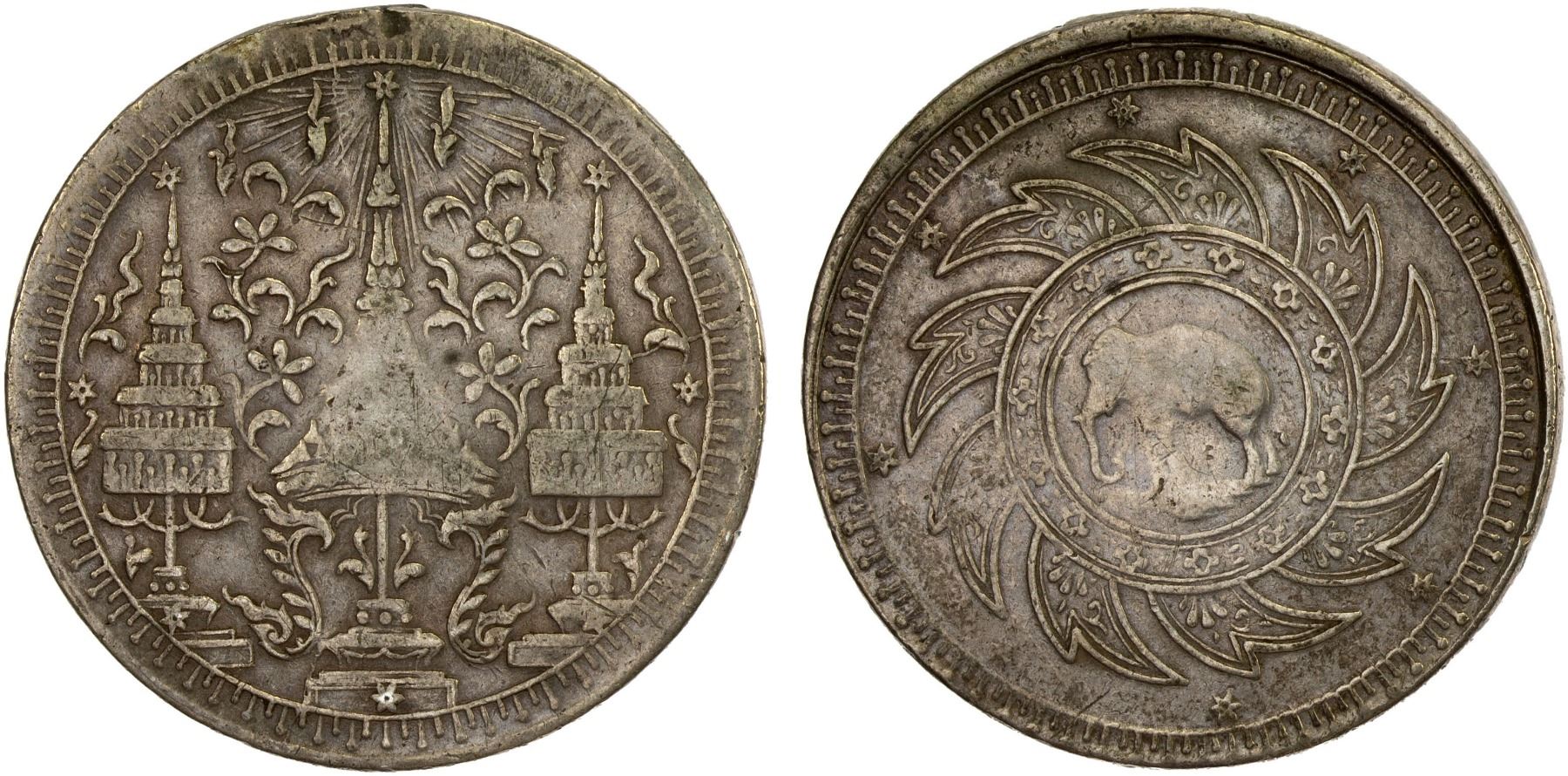 THAILAND: Rama IV, 1851-1868, AR baht, ND (1860), Y-11, crown flanked by umbrellas // elephant within chakra, small edge defect at 12h (possible mount removed), F-VF.
