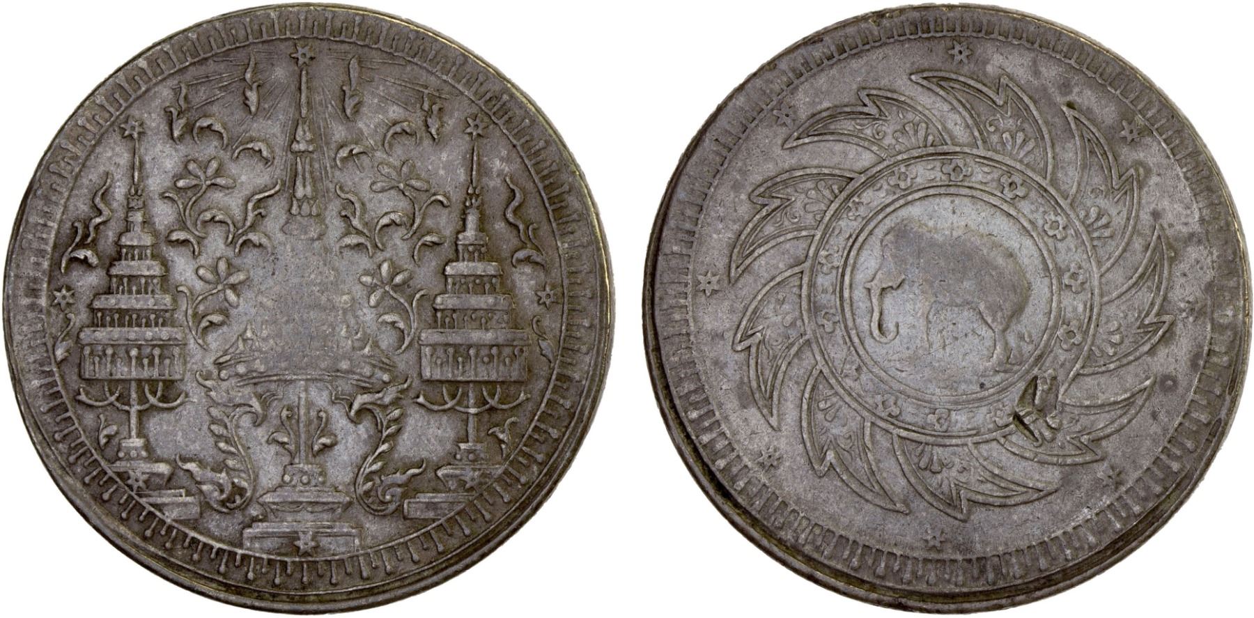 THAILAND: Rama IV, 1851-1868, AR baht, ND (1860), Y-11, crown flanked by umbrellas // elephant within chakra, one small merchant or banker's mark on reverse, VF, ex Salvatore J. Falcone Collection.